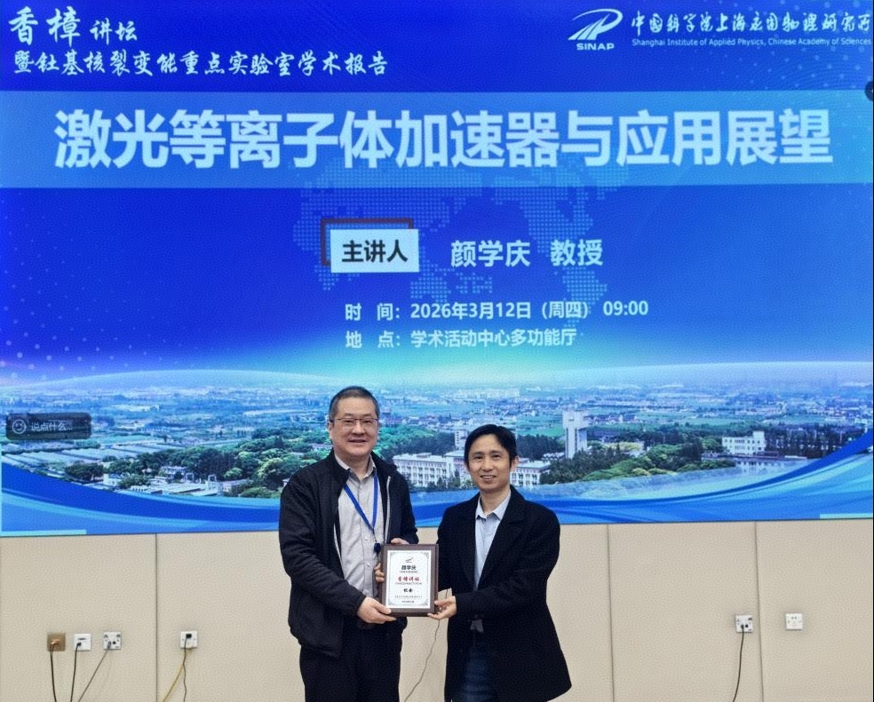 2026年3月12日,中国科学院上海应用物理研究所成功举办香樟讲坛暨钍基核裂变能重点实验室学术报告。本期讲坛邀请了北京大学颜学庆教授担任主讲人,报告主题为“激光等离子体加速器与应用展望”。上海应物所副所长、钍基核裂变能全国重点实验室主任蔡翔舟、反应堆物理部、应用加速器部等科技骨干、研究生参加了本期讲坛活动。活动由科研与教育处副处长任翠兰主持。