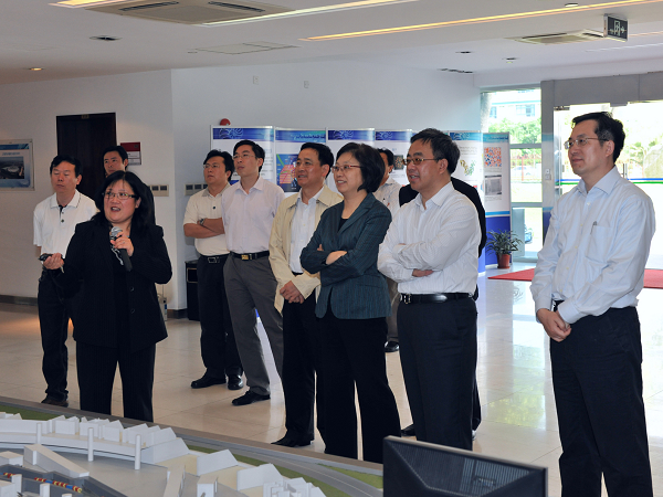 在上海光源主体模型前,胡春华同志听取了上海应用物理所副所长李燕关于上海光源工程总体情况介绍,并实地察看了上海光源中央控制室、储存环样机、光束线和实验站等科学设施。