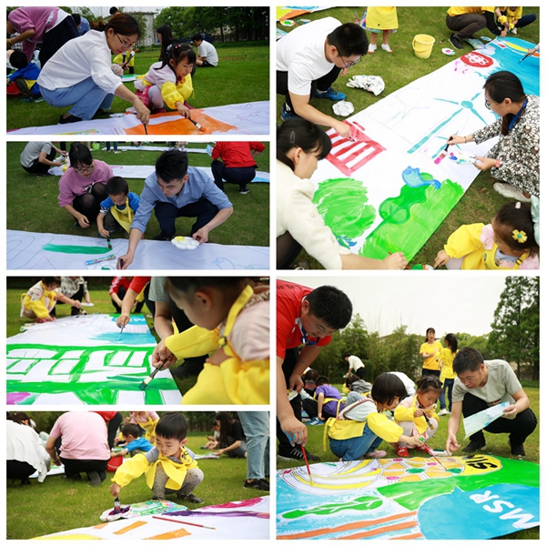 妇委介绍了巨幅画的设计思路和整个过程中的小插曲。在对巨幅画有了更多的了解后,大、小朋友们早已摩拳擦掌、跃跃欲试。在专业教练的带领下,科二代和科爸科妈们进行了亲子热身操后,戴上小围裙和小袖套,像模像样地投入到纳斯卡巨画的绘制中,俨然是一个个小画家——和爸爸妈妈讨论颜色需要怎么调,小心翼翼地在巨画上涂上颜色,看到摄影镜头过来了大方地摆出俏皮可爱的表情……六个小组你追我赶,很快,我们所畅想的未来展现在大家眼前啦!在无人机的帮助下,和巨幅画拍上不同形式的合影,围着圈的造型放松而随意,拼凑成数字“60”字型契合所庆60周年的主题。