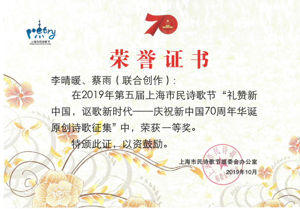 10月30日晚,第五届上海市民诗歌节诗歌盛典“用最美的诗意礼赞新中国”朗诵会在上海交响乐团演艺厅举行。今年诗歌节主题为“礼赞新中国,讴歌新时代——庆祝新中国70周年华诞”,上海应物所李晴暖、蔡雨联合创作的诗歌荣获一等奖。