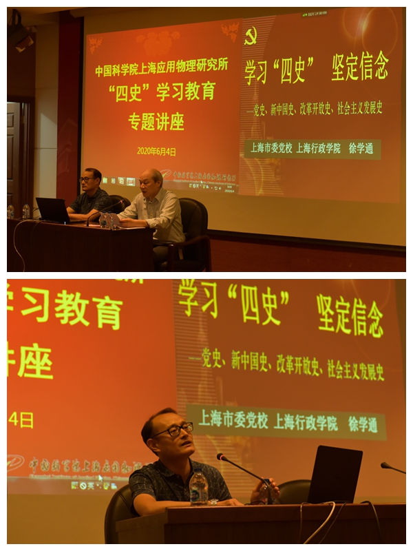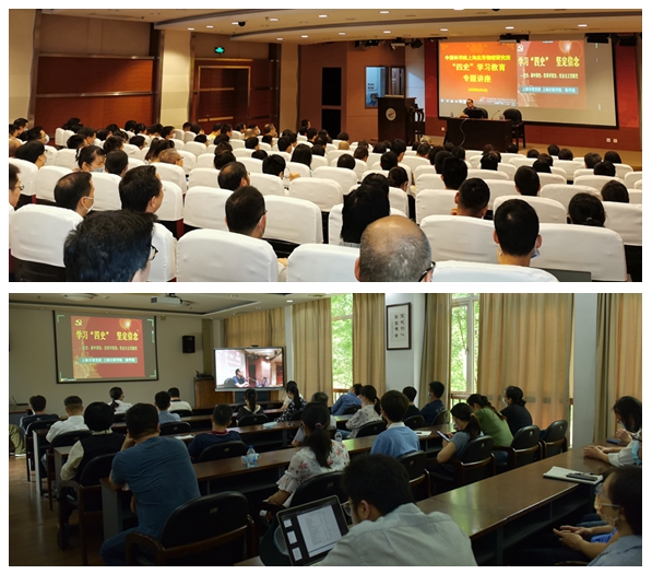 为深入贯彻落实习近平总书记关于深入开展党的历史、新中国史、改革开放史、社会主义发展史(“四史”)教育的重要讲话和批示精神,切实加强“四史”学习教育,引导广大党员、干部坚定理想信念、牢记初心使命,6月4日上午,上海应物所在嘉定园区学术活动中心三楼大报告厅(主会场)、307-308会议室(分会场)组织开展“四史”学习教育专题讲座,特邀上海市委党校教授徐学通作题为《学习“四史” 坚定信念》的辅导报告。会议由上海应物所党委书记赵明华主持,所党委委员、中层干部、职工和研究生党员共计近300人参加讲座。