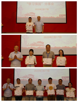 最后,与会人员学以致用,通过“挑战答题”栏目进行现场答题挑战赛。党委领导为“学习强国”分享会栏目推荐的一、二、三等奖获奖者颁奖,并为2019-2020年度“学习强国”平台人均总积分一、二、三等奖获奖支部代表颁奖。