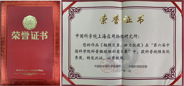 为激发院内广大科学工作者用创意分享科学奥秘,用影像记录科学之美,让科学知识在网络和生活中流行,由中国科学院科学传播局、共青团中国科学院委员会主办,中国科学院计算机网络信息中心和中国科学院网络科普联盟承办的“中国科学院第六届科普微视频创意大赛”于2020年8-11月之间开展。上海应用物理研究所选送的参赛作品《辐照灭菌、助力抗疫》经过大赛组委会评选,荣获科普视频类优秀奖。因疫情防控需要,本次不再以集体会议形式进行表彰,2021年3月12日,组委会将获奖证书以邮寄形式送达上海应物所。