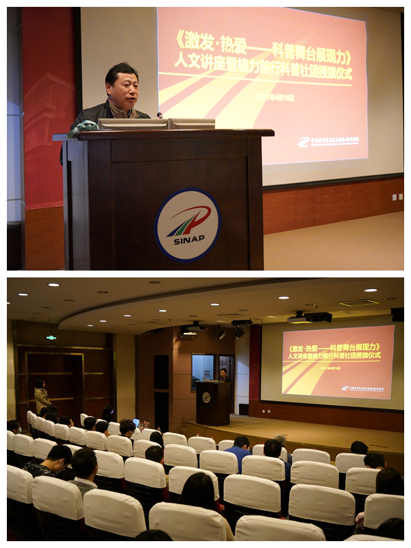为了普及科学技术知识、倡导科学方法、传播科学思想、弘扬科学精神,进一步发挥青年学生科研与科普的主力军作用,集合所内力量共同组建高素质的科普工作队伍, 2021年4月16日下午,上海应物所科研与教育处和信息中心在学术活动中心大报告厅联合举办了《激发·热爱—科普舞台展现力》人文讲座暨核力前行科普社团授旗仪式。上海应物所副所长贺战军出席活动并为社团授旗,科研与教育处、信息中心、核力前行科普社团成员、研究生志愿者及部分管理部门职工参加活动。活动由科研与教育处副处长钟静主持。