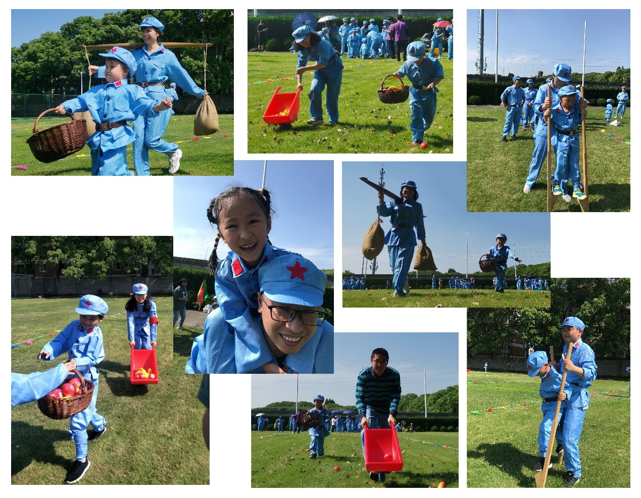 热身活动后,大家兵分四路。在教官的带领下,以趣味运动的形式,“大小红军”体验红军长征途中具有革命历史的经典项目:《朱德的扁担》、《海娃送鸡毛信》、《艰苦长征路》、《南泥湾抢收》等,把运动会氛围推向高潮。绿茵场上,艳阳高照、清空万里,蔚蓝的天空下,“小红军”们朝气蓬勃、活力十足;“大红军”们精神饱满、热情高涨;大手拉小手、团结合作,在运动竞技中共同体验不畏艰难、不怕困苦的长征精神。
