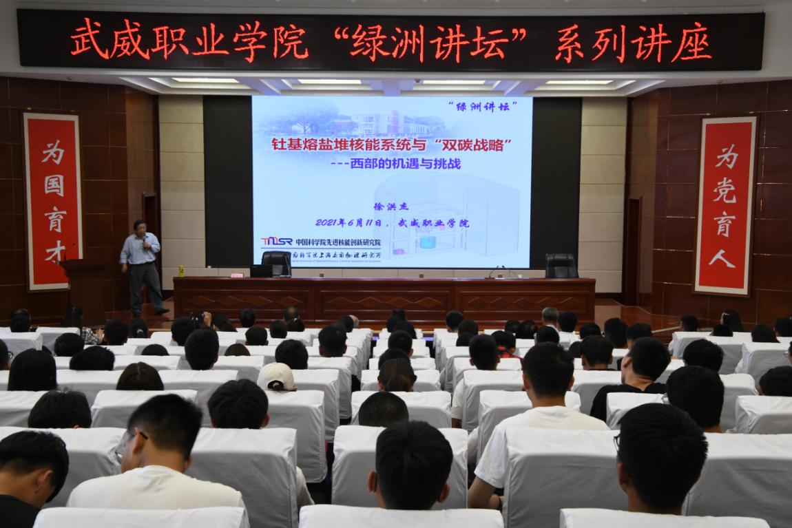 2021年6月11日,中国科学院上海应用物理研究所原所长、中国科学院先进核能创新研究院院长徐洪杰研究员受邀来到武威职业学院,为第45期“绿洲讲坛”做《基于钍基熔盐堆的风光核储多能融合系统——西部“双碳战略”之路的机遇和挑战》的主旨报告。上海应物所党委书记赵明华、武威园区办主任赵先堂、联合办学业务主管兼中科低碳新能源技术学院院长助理米丽娟随同参加。本期论坛由武威职业学院党委书记、院长赵明主持,党委副书记兼中科低碳新能源技术学院副院长翟存祥出席会议。出席本次论坛的还有武威职业学院领导班子成员、中层干部、各院系师生代表共220余人。
