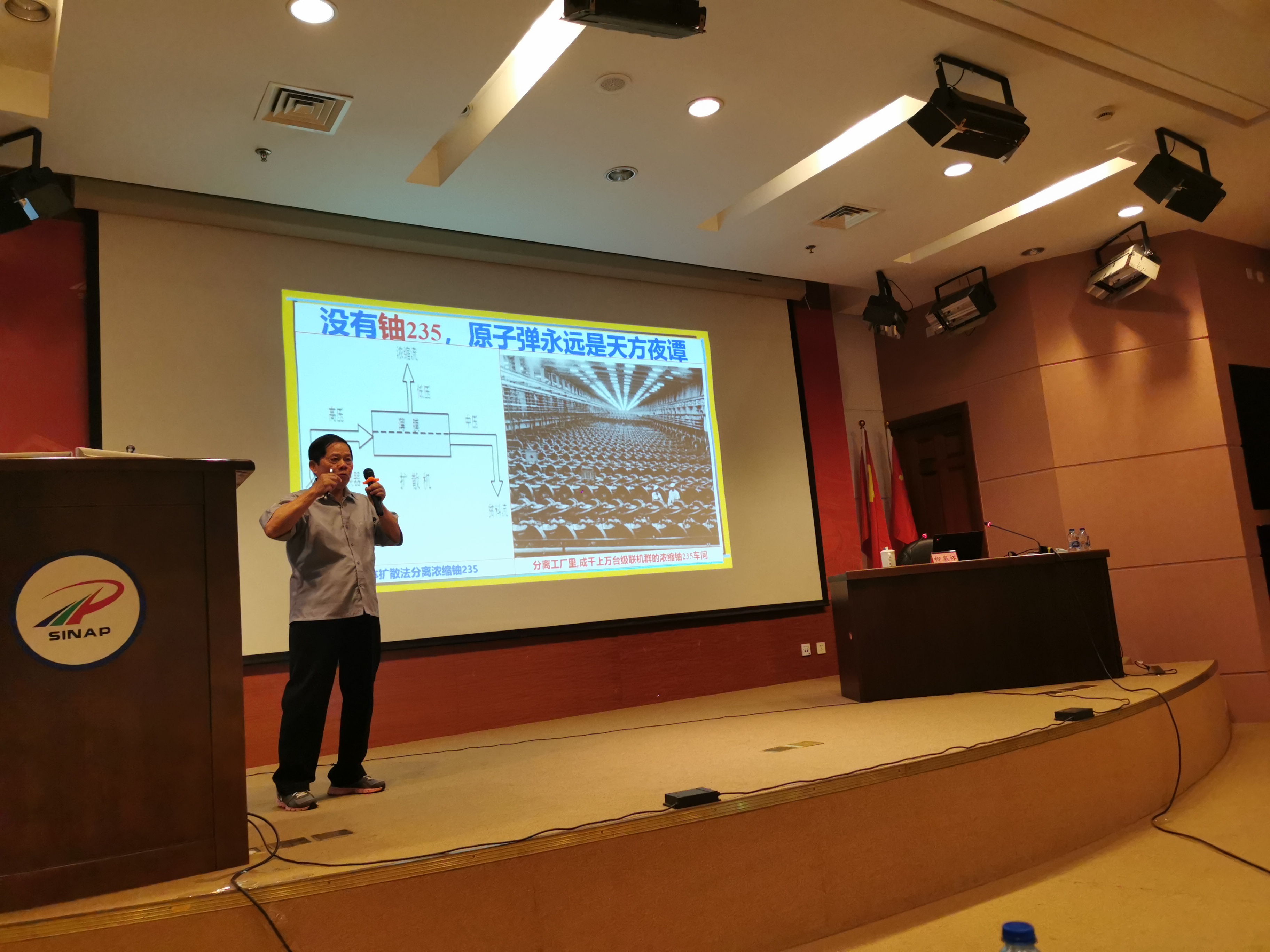 曾参与我国第一颗原子弹的相关制造技术--项目代号为“真空阀门”的攻关研究的老科学家柳襄怀,作了题为《干惊天动地事,做隐姓埋名人》的报告。他动情地回忆了那一段为蘑菇云早日升空而奋斗的峥嵘岁月,与大家共勉:“要永远为我们的国家努力奋斗”!真挚的爱国情怀,艰苦奋斗的精神,为科研事业奋斗的热情,都值得我们学习,也将鼓舞我们向着核能事业的目标不断前行。