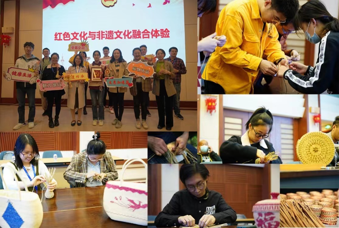 会议还邀请到了国家非物质文化遗产徐行草编的传承人王勤老师为大家带来了红色文化与非遗文化融合体验。活动中,老师从草编仙子的美丽传说开始,详细介绍了徐行草编的文化传承、工艺流程和推广体验,最后王老师还向大家展示了为纪念中国共产党成立100周年特别制作的“一大会址”以及“南湖红船”草编作品。有了初步的认识后,大家便在老师的指导下,自己动手体验了简单的花瓶、杯垫和挂坠的草编制作。虽然制作的成品不如老师的精细规整,但大家都非常认真,黄草在经纬之间翻飞,每一步都凝结着手工艺人的心血。“黄草在指端,咫尺匠心难”,经过这次体验,让大家感受到了非遗文化的强大魅力,体会到了工匠精神的意义所在。