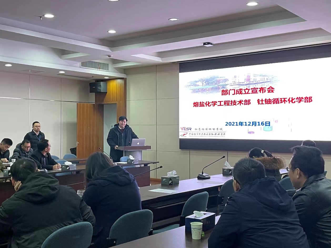 2021年12月16日,上海应物所召开“熔盐化学工程技术部”和“钍铀循环化学部”部门成立宣布会,所长戴志敏,党委书记唐裕华,副所长李晴暖出席会议,熔盐化学工程技术部和钍铀循环化学部全体成员和科教处、人事处负责人参加会议。