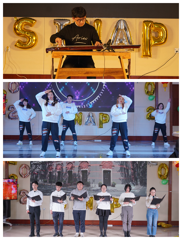 在第二篇章“庆贺当下美好生活”中,陈亮同学古琴独奏《大鱼海棠》琴声婉转绵延,不绝如缕,令观众们沉醉其中;所工会职工带来的《漠河少年》意气风发,表达了职工踏上2022年研究所事业新征程的热忱。2021级博士党支部研究生的诗朗诵《当我开始真正爱自己》表达了风华正茂的学子们乐观向上的态度。汪婷和马琳同学带来的《你被写在我的歌里》歌声悠扬,使人沉醉神往心灵深处的宁静。研究生乐队SINAPUREX 带来的《只对你有感觉》,曲短情长,展现了青年学子新时代青春昂扬的风采。