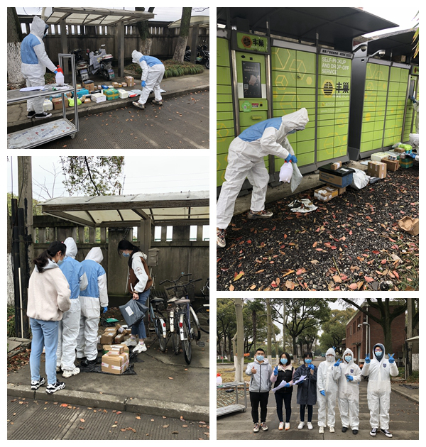 在了解到身边同学们急需解决的快递滞留问题后,志愿者们制定科学合理取件方案,通过问卷手机相关信息,对同学们提供的柜机号、取件码等信息进行仔细核查,做好滞留保管费的登记,严格做好防护措施,身着防护服对滞留丰巢柜的快递的外包装进行喷洒、擦拭,确保全面消杀,然后再将快递分批运送回园区内,力求防控细节到位。2个小时后,志愿者们对快递进行了分拣,并确保约130件快递全部安全送到同学们手中。