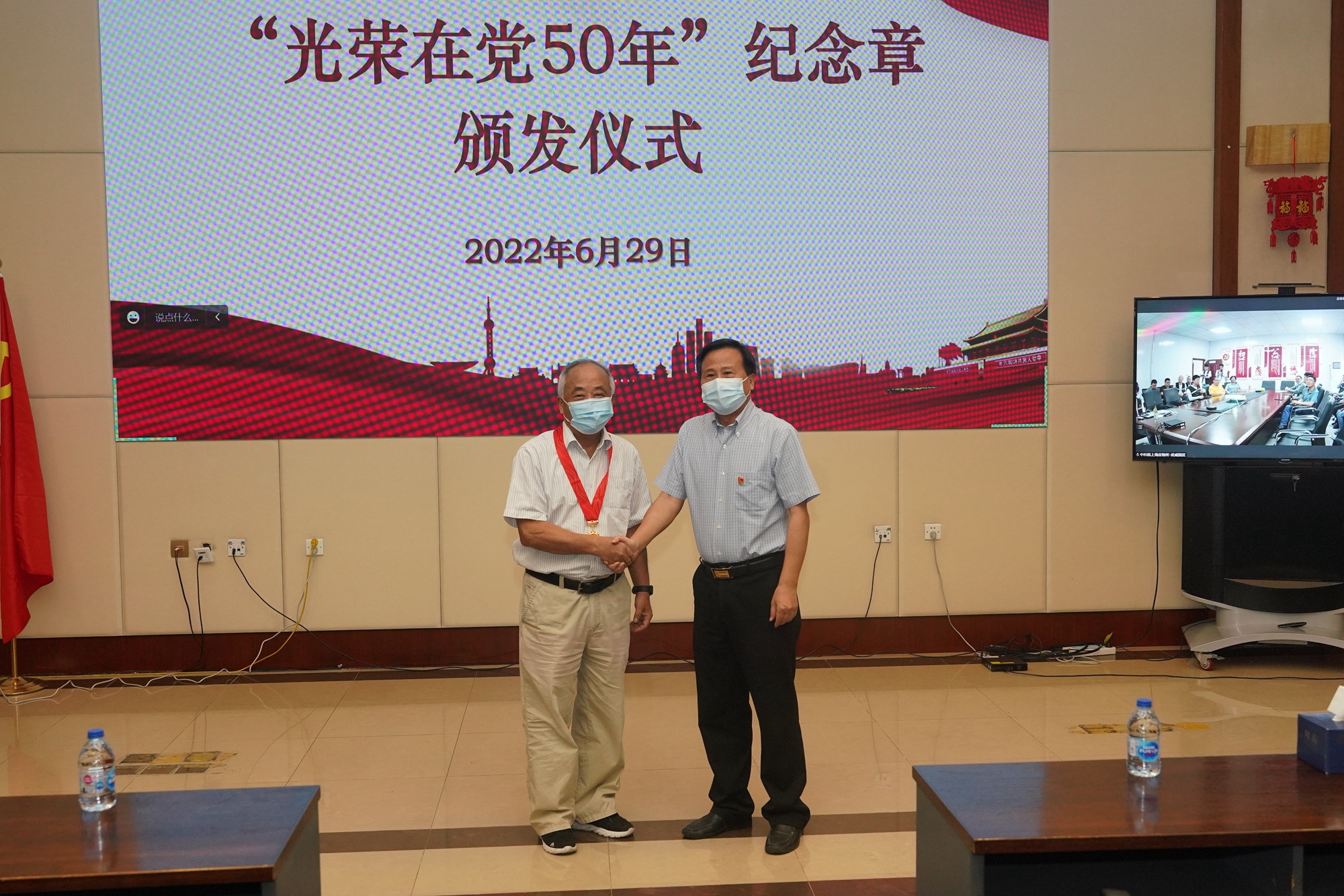 会议首先进行了新党员入党宣誓,随后举行了“光荣在党50年”纪念章颁发仪式,党委书记唐裕华为“光荣在党50年”纪念章获得者陆晓峰颁发纪念章。