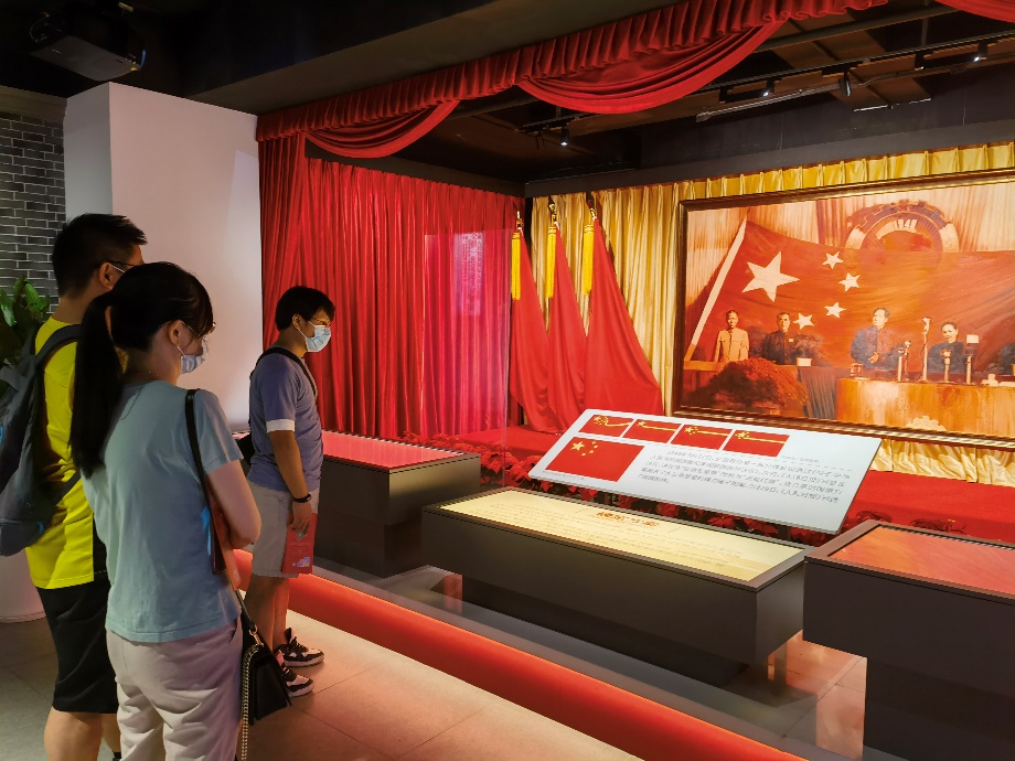 紧邻四大纪念馆的国旗教育展示厅,通过沉浸造景、互动体验等方式展现了国旗创作诞生的伟大历程和人民群众爱国旗的动人故事。展示厅展出了曾联松国旗设计手稿,三沙市、上海海军基地、兵器军工厂等征集的国旗原件等近100件展品。展示厅内整体风格庄严大气,以组合式展台凸显 “团结凝聚”的内涵,大家被各种声光电手段生动、立体的演绎的重要时刻所感动,引发我们对国旗的记忆,激发了热爱国旗、热爱祖国的家国情感。