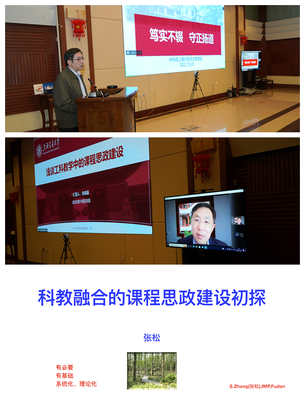 杨振华做了题为“笃实不辍,守正扬道”的报告。系统阐述了在充分了解当代研究生的特点基础上如何做好课程思政的总体要求和实施途径,强调导师在课程教学与科研实践中的育人作用,同时他介绍了上海分院教育基地英语教学和专业课程教学过程中的课程思政建设情况。刘晓晶教授以“浅谈工科教学中的课程思政建设”为题,阐述如何根据工科专业人才培养要求、结合专业特点构建科学合理的课程思政体系,并通过教学案例介绍了核科学技术专业课程在教学策略中融于课程思政元素的教学方法。张松研究员在会上解读了《高等学校课程思政指导纲要》的要点,分享了自己在课程教学实践中的思考并对核物理专业课程思政教学设计进行了具体介绍。