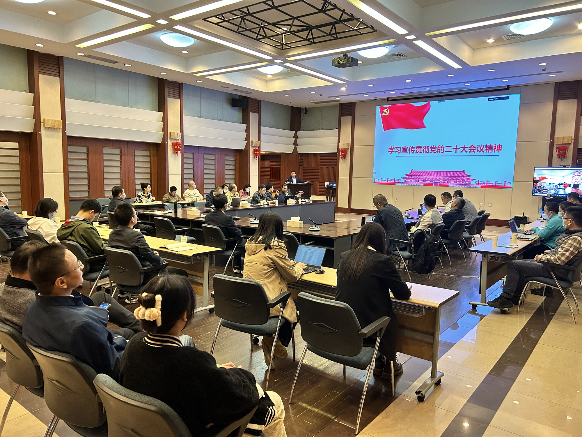 10月27日下午,上海应物所召开党委理论学习中心组专题学习扩大会暨学习贯彻党的二十大精神动员部署会。班子成员、两委委员、党支部书记和职能部门负责人参加会议。会议由党委书记唐裕华主持。