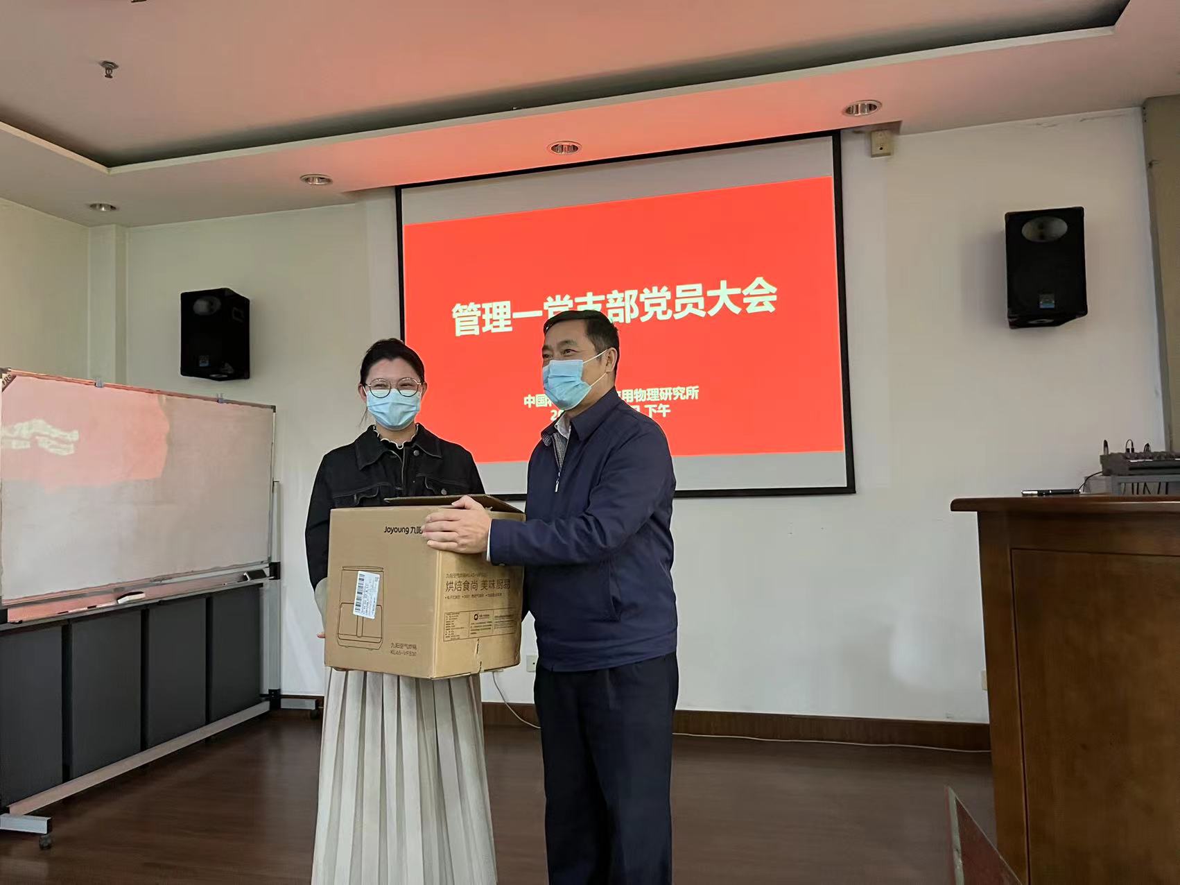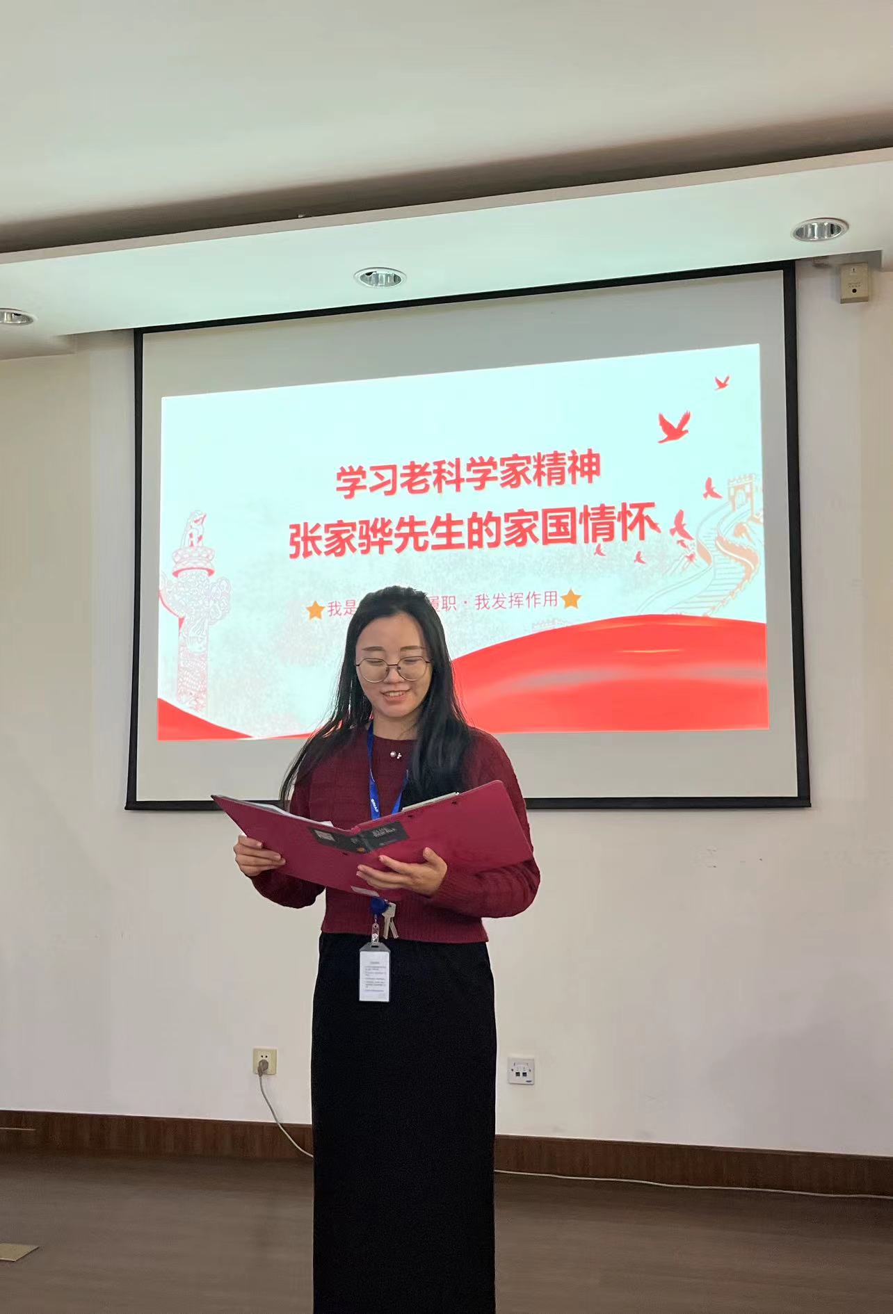 此前为迎接二十大,管理一党支部组织了丰富的主题活动,在本次会上进行了交流和分享。为响应上海分院组织的“我是党员 我履职 我发挥作用”活动,管理一党支部选送了陈佳妍的主题演讲“我讲张家骅的故事”,在党员大会进行了现场朗诵,使大家重温了老所长张家骅矢志科研、甘于奉献的老科学家精神和报国情怀;管理一党支部近期开展了学习强国知识竞赛活动,会上公布了竞赛结果,吉峻为获奖代表颁奖。