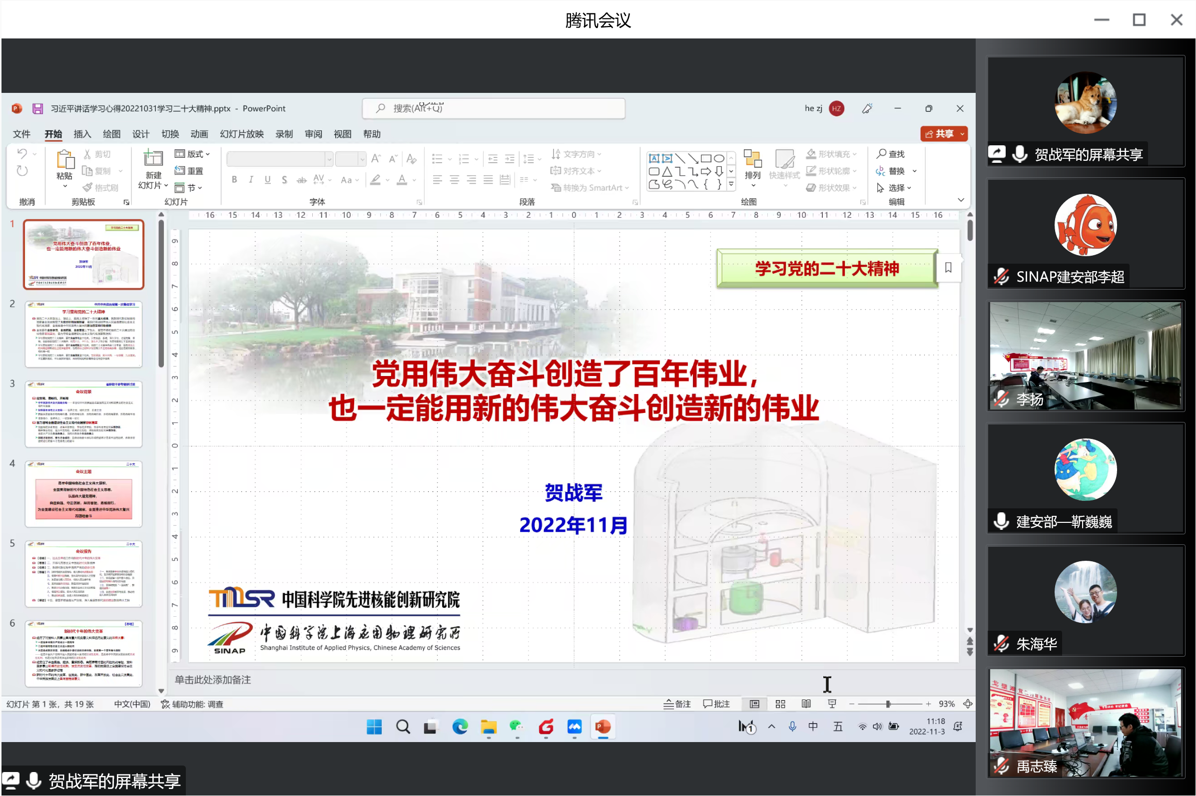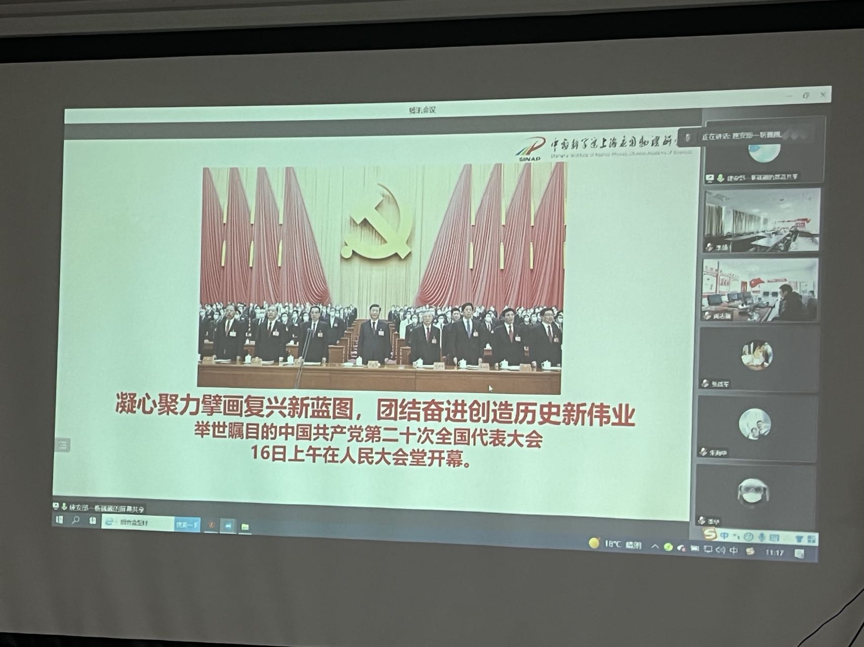 副所长贺战军作《党用伟大奋斗创造了百年伟业,也一定能用新的伟大奋斗创造新的伟业》的报告。报告指出,学习贯彻党的二十大精神,要在全面学习上、全面把握上、全面落实上下功夫。报告讲述了二十大的会议背景,我党应变局、育新机、开新局,用奋斗谱写了全面建设社会主义现代化国家崭新篇章;介绍了新时代十年的伟大变革、开辟马克思主义中国化、时代化新境界,同时也要求各位同志聚焦主责主业,在科研、管理上做前无古人之事,坚持守正创新、勇于自我革命,要勇于说前人没有说过的新话,敢于干前人没有干过的事情。