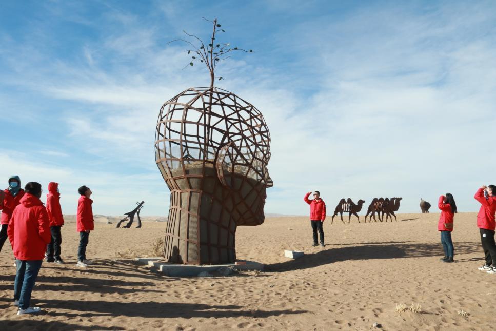 时值初冬,大家首先乘车来到了位于腾格里沙漠中的雕塑公园,在充满艺术和科技气息的雕塑作品前驻足观看。党的二十大提出,尊重自然、顺应自然、保护自然,是全面建设社会主义现代化国家的内在要求。在自然与艺术和谐统一的沙漠雕塑公园里,大家深刻感受了艺术家通过雕塑表达出来的对人与自然的思考。