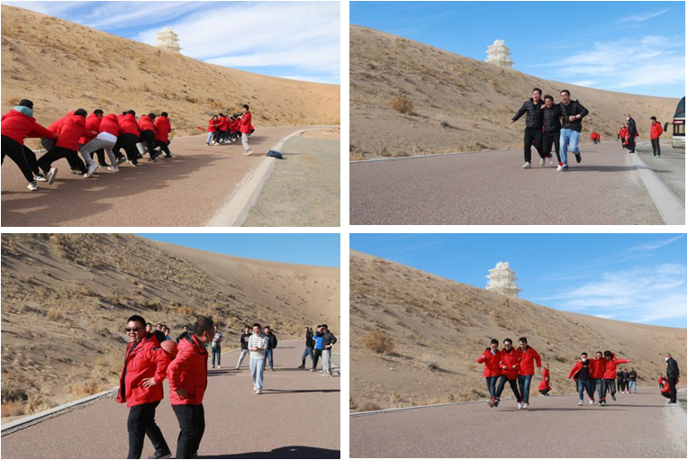 在团建环节,大家在沙漠边缘开展夹篮球接力、拔河比赛、三人四足等互动小游戏。大家全神贯注、团结一致,在游戏中体会团队协作的力量,在紧张的工作之余更加增进了彼此的了解和友谊。