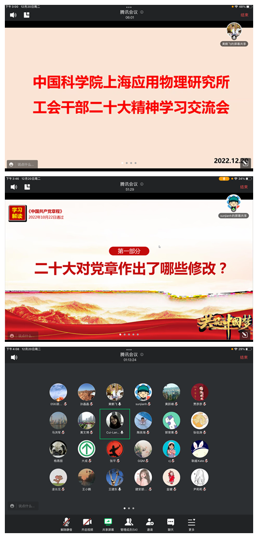 为深入学习宣传贯彻党的二十大精神,充分发挥工会的优势和作用,2022年12月20日,中国科学院上海应用物理研究所召开工会干部二十大精神学习交流会。本次交流会采用线上学习的方式,所工会委员、经审委员、分工会主席和委员等共50余人参会。