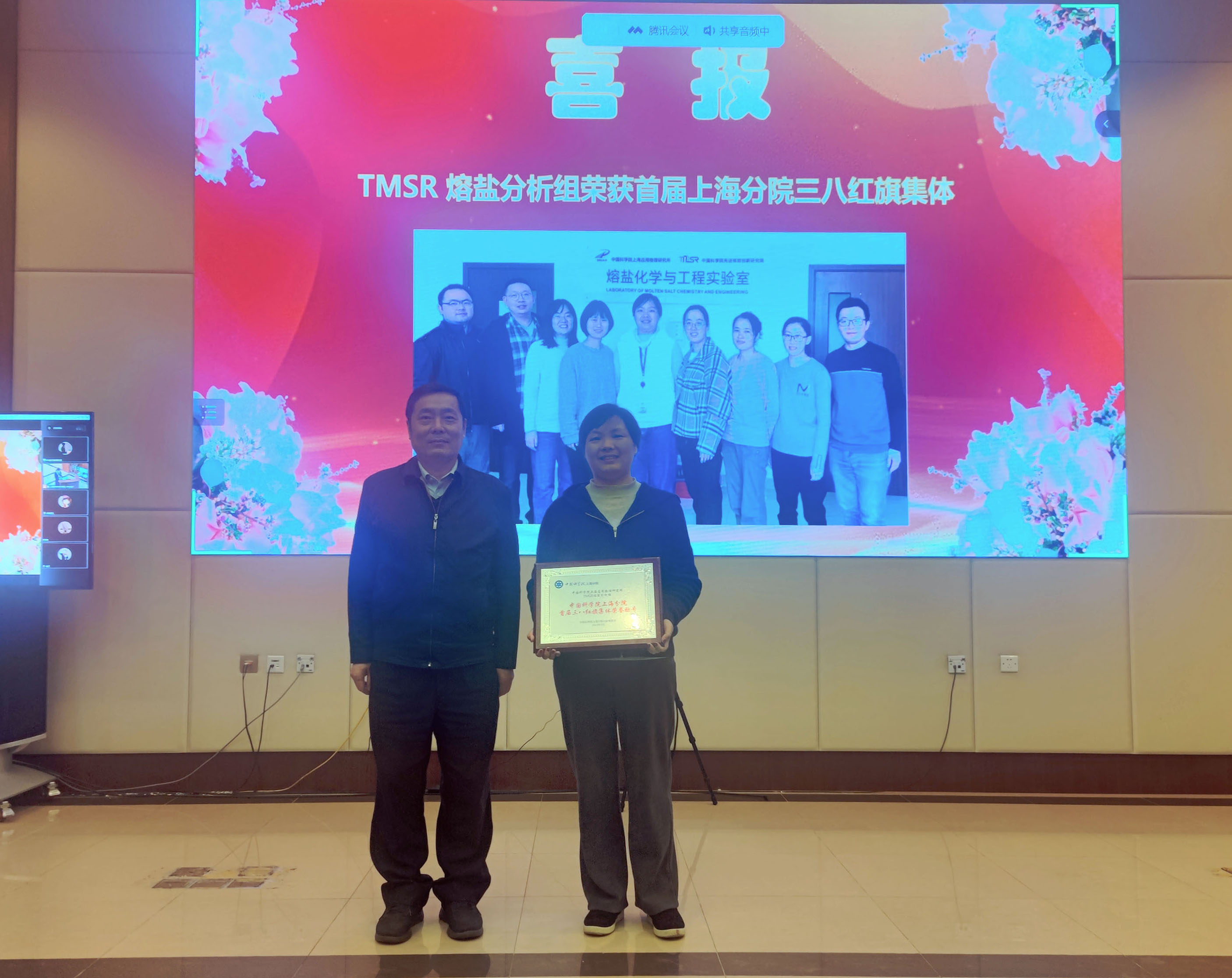 会上举行了上海分院三八红旗集体颁奖仪式。今年三月,上海分院妇委为进一步贯彻落实党的二十大精神,用榜样的力量激励引领广大女职工积极投身科技创新,开展了首届上海分院“三八红旗手”、“三八红旗集体”的评选表彰,我所“TMSR熔盐分析组”荣获首届上海分院三八红旗集体称号。近年来,她们携手并肩,建立了系列堆用熔盐质量分析技术规范,为熔盐堆建设提供了良好的技术支撑,保障实验堆用盐质量。她们秉承追求卓越、精益求精的工作原则,展现我所女科技工作者的担当。吉峻为TMSR熔盐分析组的团队负责人葛敏颁发了荣誉奖牌。