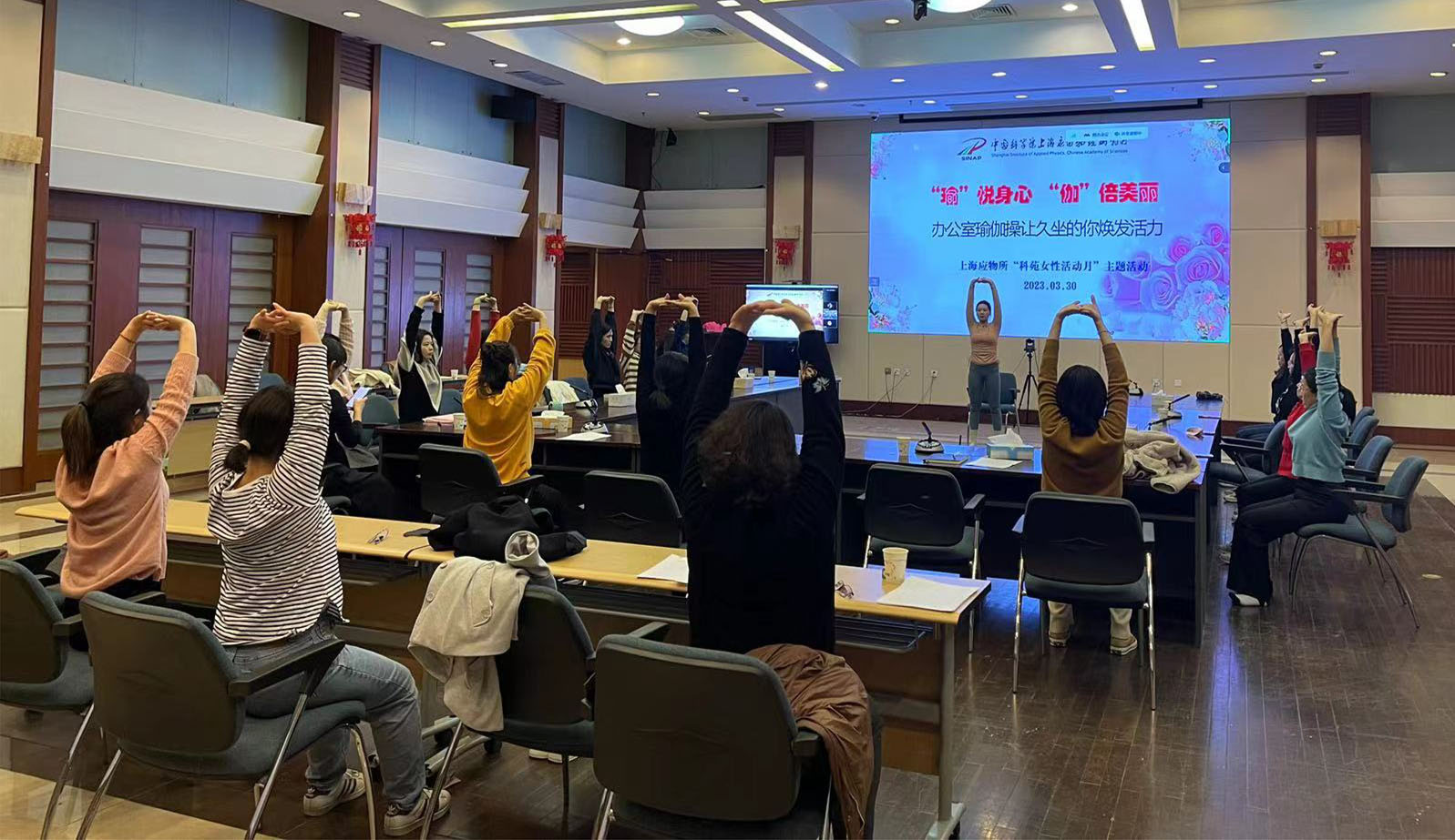 活动最后,所妇委邀请了专业的老师进行了“‘瑜’悦身心,‘伽’倍美丽”办公室瑜伽操教学活动,带领现场女职工练习健康瑜伽操,在肢体舒展中释放工作压力,让久坐的身体焕发活力。