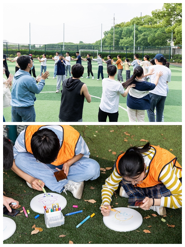 在教练的带领下,同学们通过松鼠与大树、激情节拍等游戏增进相互了解。随后教练介绍了飞盘的发展历程,运动技巧及游戏规则。在飞盘DIY活动中,各个小组都展示了精美绘画的飞盘。