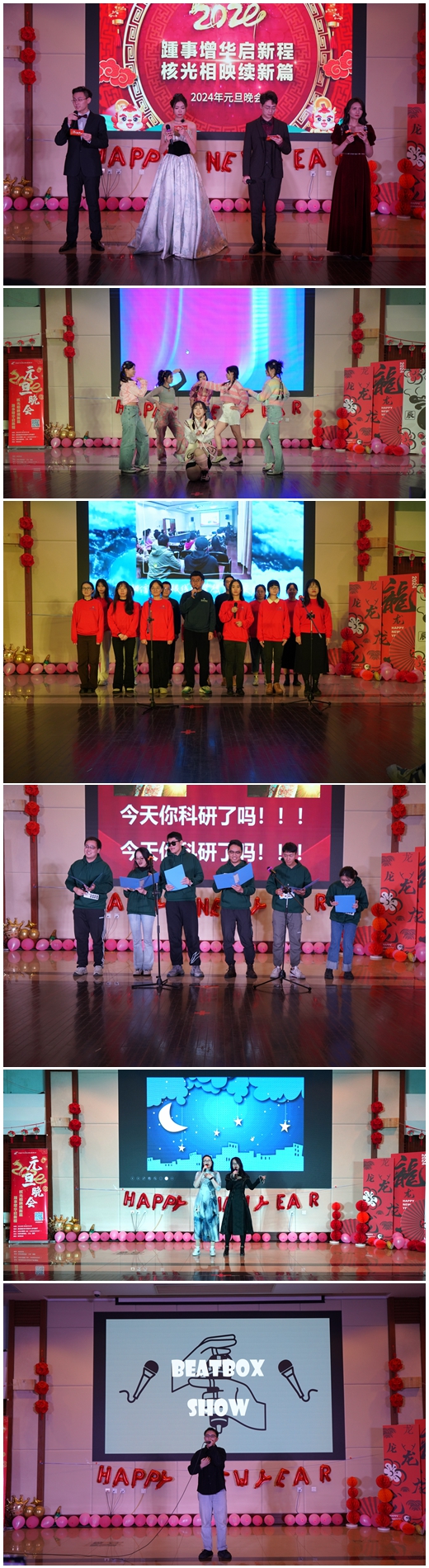 元旦晚会在全体演职人员的《相亲相爱》歌声中拉下帷幕。2024年“踵事增华启新程,核光相映续新篇”元旦联欢晚会充分展示了我所职工与研究生奋发进取的精神风貌,应物所人在新的一年必将豪情满怀,砥砺奋进,共同创造美好的未来。(科研与教育处 供稿)