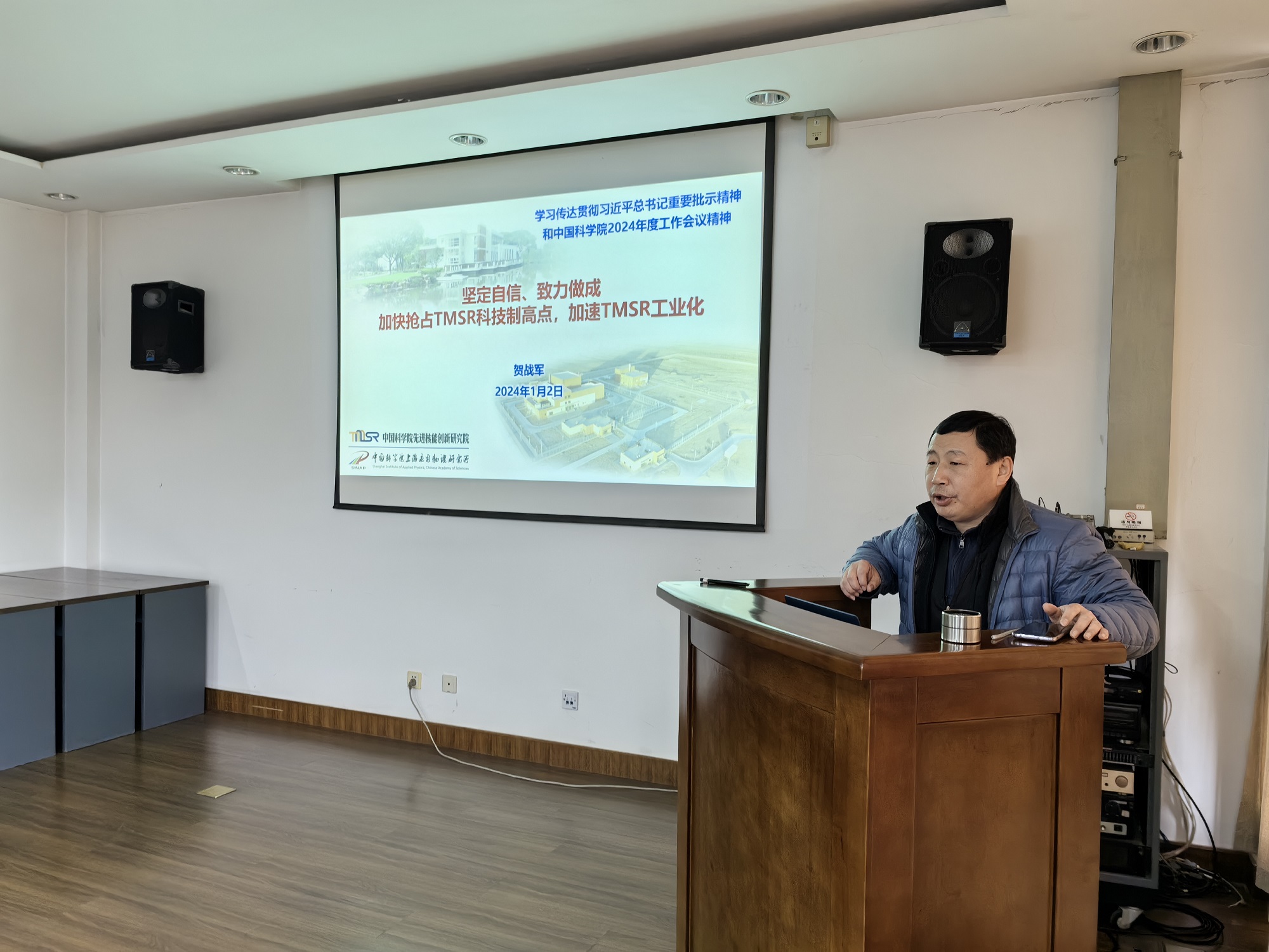 所党委委员、副所长贺战军以《坚定自信、致力做成,加快抢占TMSR科技制高点,加速TMSR工业化》为题,传达了习近平总书记对中国科学院工作的重要指示批示精神和中国科学院2024年度工作会议精神,并结合研究所及三个支部的工作交流了学习体会。他强调,加快抢占一批科技制高点,是党中央赋予我院的光荣使命和重大责任,是我院作为国家战略科技力量的核心任务。我所肩负发展钍基熔盐堆核能系统的重大任务,更要进一步强化使命意识和责任担当,胸怀“国之大者”,强化应用导向和协同创新,围绕抢占科技制高点目标谋划各方面、各部门工作,狠抓落实。