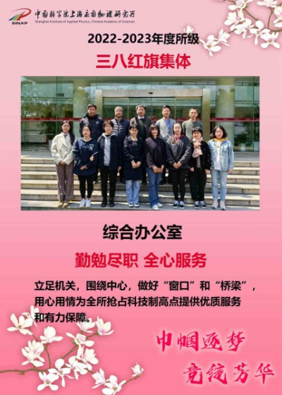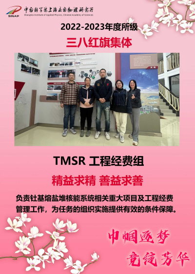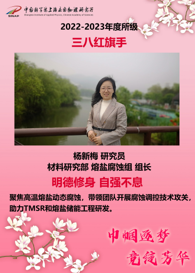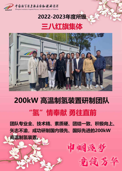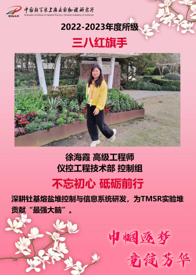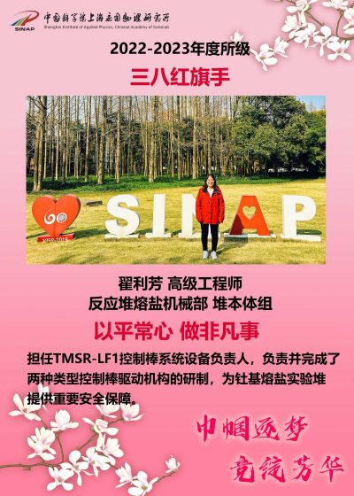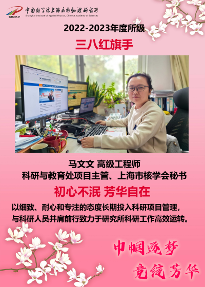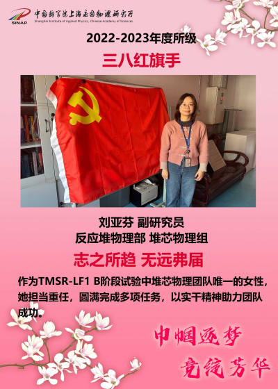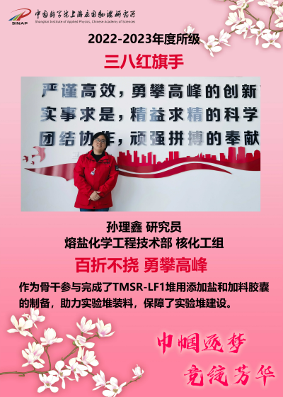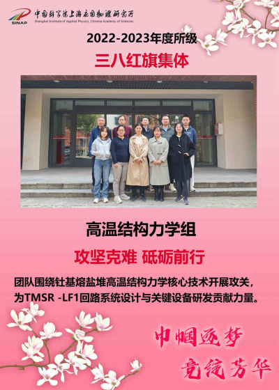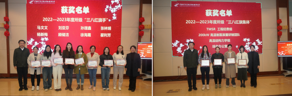 会上首先进行“奋斗——巾帼逐梦,竞绽芳华”选树表彰。王茂华宣读了获得市科技系统荣誉、所级荣誉的集体/个人名单。经评选,李晴暖荣获上海市科技系统心系女职工好领导称号,任翠兰荣获上海市科技系统优秀妇女工作者称号,周翀荣获上海科技系统三八红旗手称号;马文文、刘亚芬、孙理鑫、杨新梅、张林娟、顾储洁、徐海霞、翟利芳被评为“上海应物所2022-2023年度三八红旗手”;200kW高温制氢装置团队(负责人:肖国萍)、TMSR工程经费组(负责人:王亚坤)、高温结构力学组(负责人:王晓艳)、综合办公室(负责人:蔡雨)被评为“上海应物所2022-2023年度三八红旗集体”。李晴暖和王茂华共同为获奖个人和集体负责人颁奖,希望受到表彰的个人和集体珍惜荣誉、再接再厉,在各自的工作岗位上进一步发挥先锋模范作用。