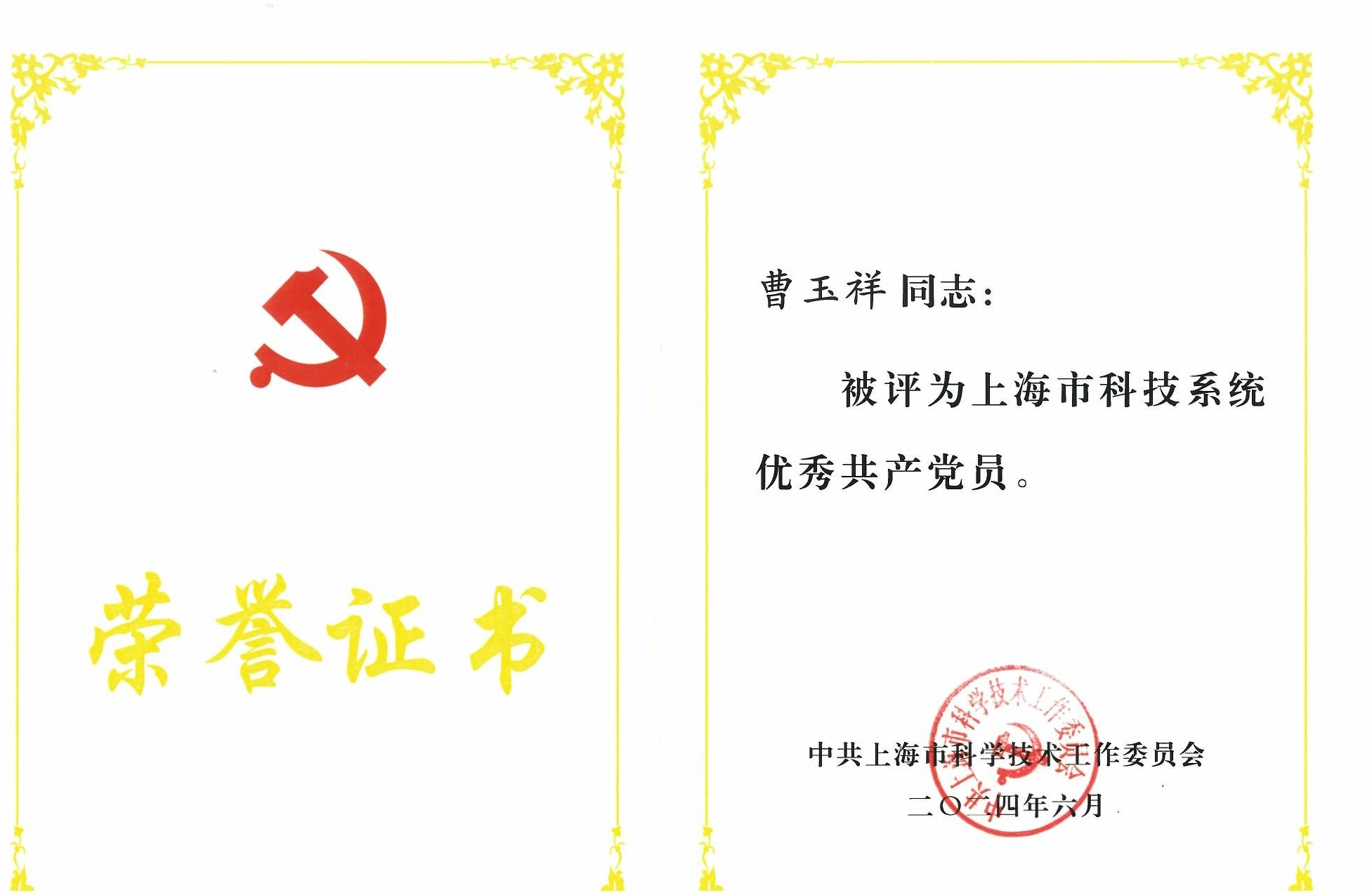 6月28日下午,上海市科技系统召开庆祝中国共产党成立103周年表彰大会,会上对上海市科技系统优秀共产党员、优秀党务工作者和先进基层党组织进行表彰。中国科学院上海应用物理研究所曹玉祥同志荣获“优秀共产党员”荣誉称号,熔盐机械党支部荣获“先进基层党组织”称号。