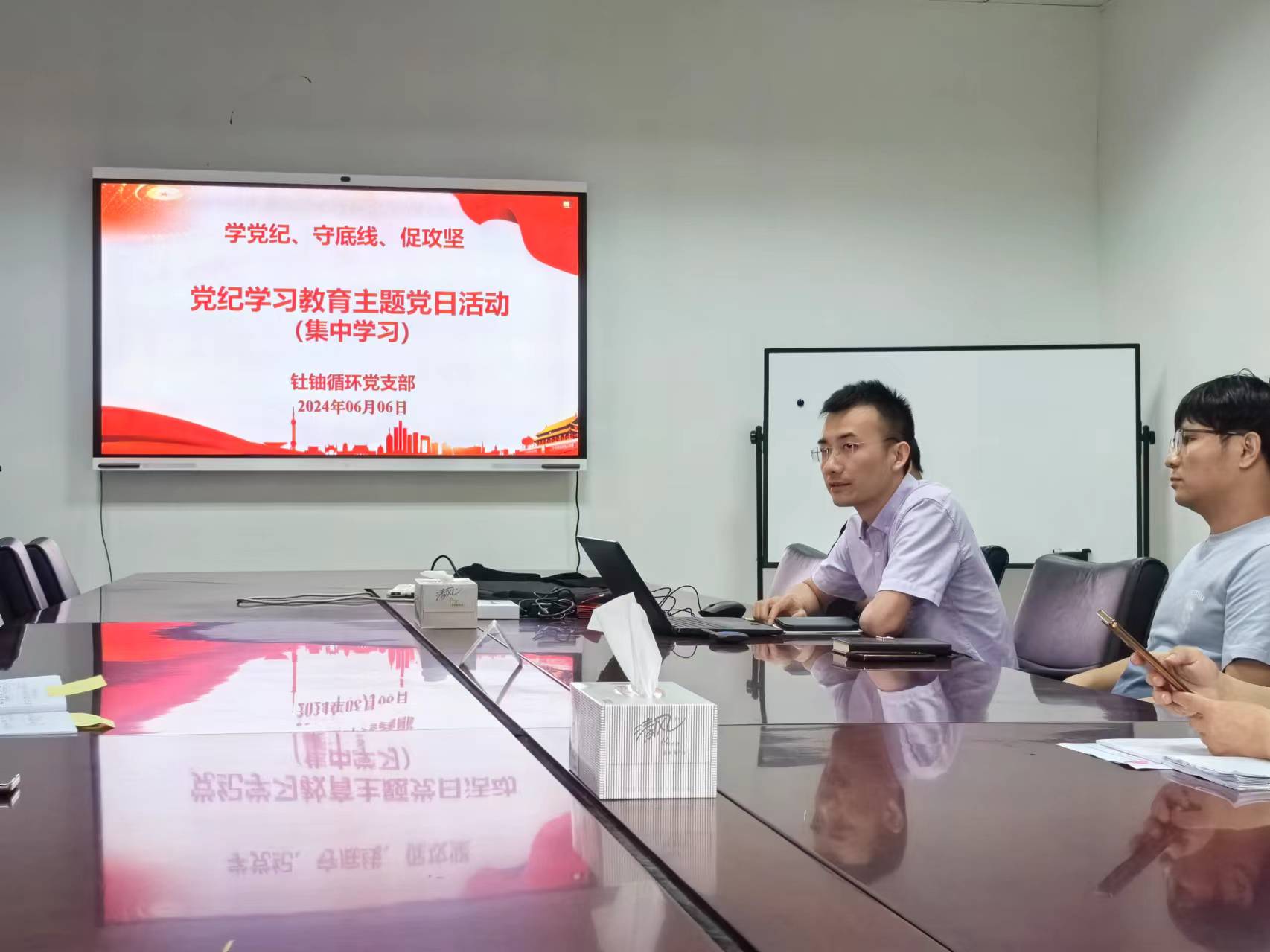 6月6日,支部开展党纪学习教育主题党日活动,支部书记周金豪以“严守纪律规矩、勇于自我革命——加快抢占钍铀循环化学科技制高点”为题讲纪律专题党课,引导党员们认真学习党的自我革命重要论述的精神内涵,深入领悟党纪学习教育的深远意义,以忠诚之心、清廉之风和担当之责,践行抢占科技制高点的使命任务。纪检委员程治强带领全体党员学习新修订的《中国共产党纪律处分条例》,并结合鲜活案例对六大纪律进行了深入细致地解读, 提醒党员们要增强纪律意识和法规观念,以案为鉴,警钟长鸣。