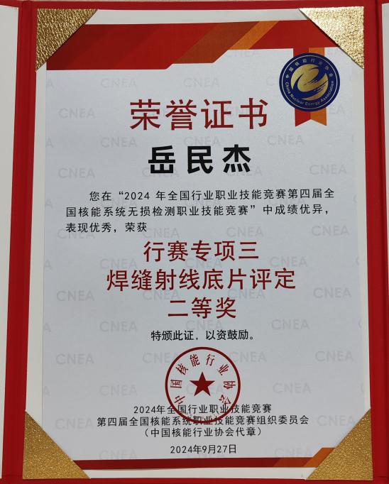 来自核能行业近50家骨干单位共计183名选手同台竞技,参赛选手绝大多数为核工业无损检测Ⅲ级(高级)人员。本次大赛涵盖了当前核能行业制造安装领域使用的典型无损检验方法,体现了核能行业无损检验活动的特色,代表了核能行业无损检验技能的最高水平,大赛在办赛规模、赛事规格、参赛人数等方面创历史新高。根据理论考试与实际操作考试的综合成绩排名,中国科学院上海应用物理研究所熔盐机械工程技术部职工岳民杰在行赛专项三射线检验项目中获得二等奖。