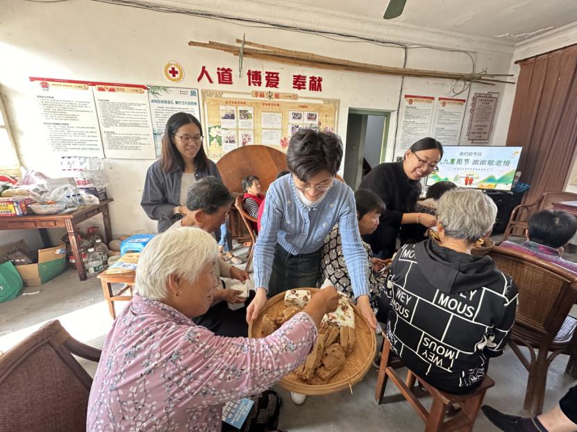 在活动中,党员们在小庙村志愿者的引领下,抵达小庙村卢家组客堂汇,为村里的老人们送上重阳糕,并向他们致以节日的祝愿与问候。党员们与老人亲切地唠家常,关心老人的身体状况和生活情况,热心叮嘱老人天气渐冷,要注意增添衣物保暖。一句句关怀话语,蕴含着真挚的敬老情谊。