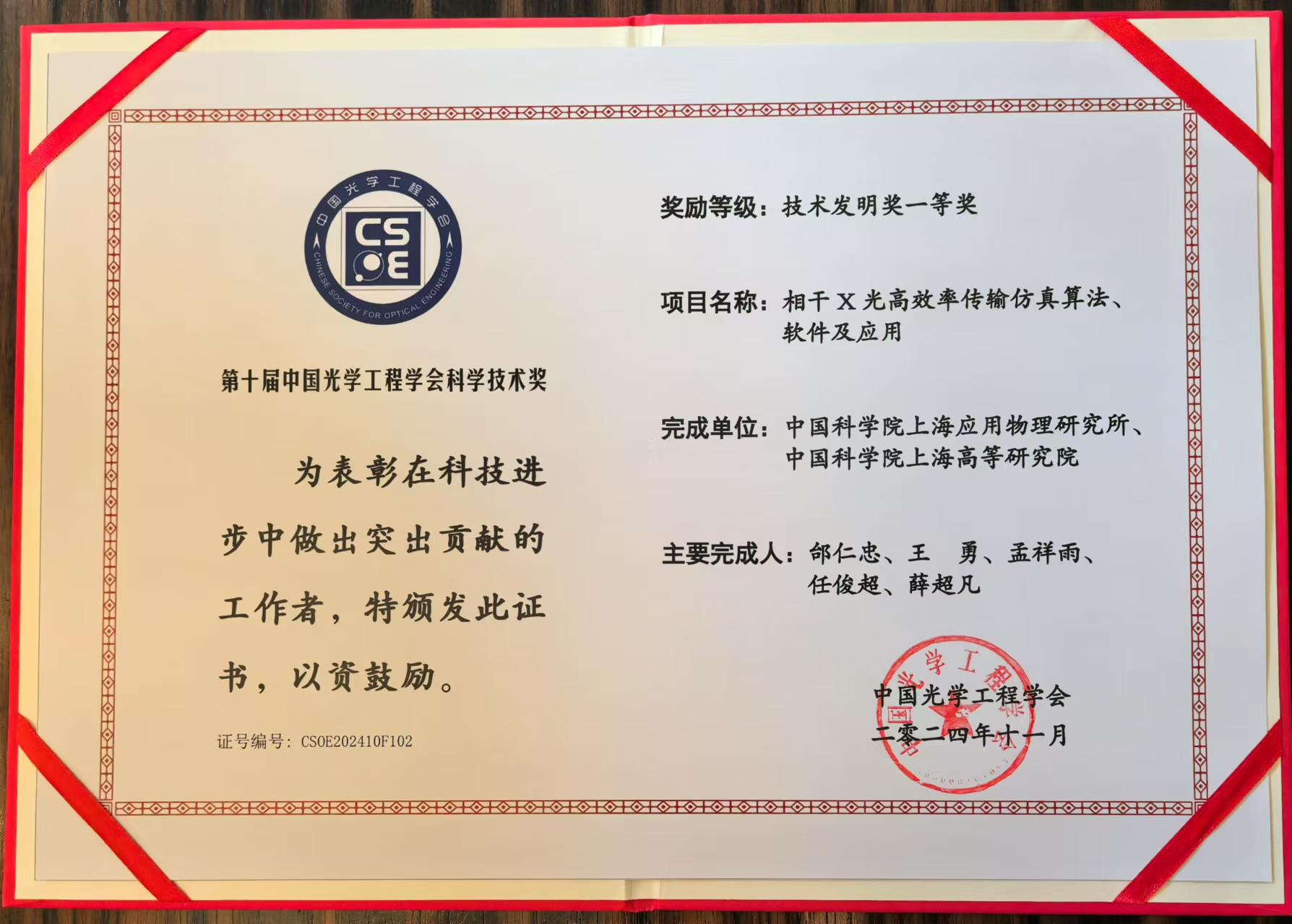 上海光源邰仁忠研究员团队完成的“相干X光高效率传输仿真算法、软件及应用”项目荣获技术发明奖一等奖,项目主要完成人依次为邰仁忠、王勇、孟祥雨、任俊超、薛超凡,完成单位依次为中国科学院上海应用物理研究所和中国科学院上海高等研究院,这也是我所首次以第一单位荣获中国光学工程学会科学技术奖。