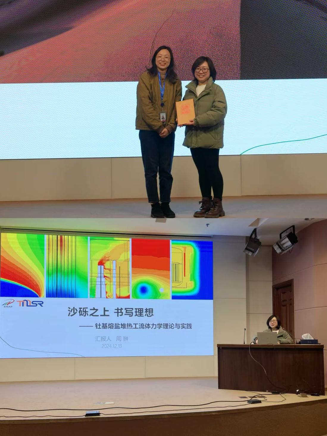 钟静为第六期授课导师周翀颁发了“迎鹭讲堂”讲师聘书。周翀以《沙砾之上 书写理想——钍基熔盐堆热工流体力学理论与实践》为题作报告,从自身的经历出发,阐述了钍基熔盐堆热工流体力学的研究内容与研究进展,通过具体的事迹展现了其团队在面对理论研究、设备安装、特性试验等不同方面的难题时不畏辛劳、攻坚克难的事迹,最终为项目的成功贡献了不可或缺的力量。听完周翀研究员及其团队的科研经历,在场的每一位研究生都被科学家们那种扎根戈壁、勇攀科学高峰的科研精神,以及他们在研究过程中展现出的乐观向上、对科研的热爱深深打动。这一份坚持和热情,激励着年轻一代在未来的学术道路上勇往直前,无论环境如何,他们都将坚守初心,以饱满的热情迎接每一个新的机遇与挑战。