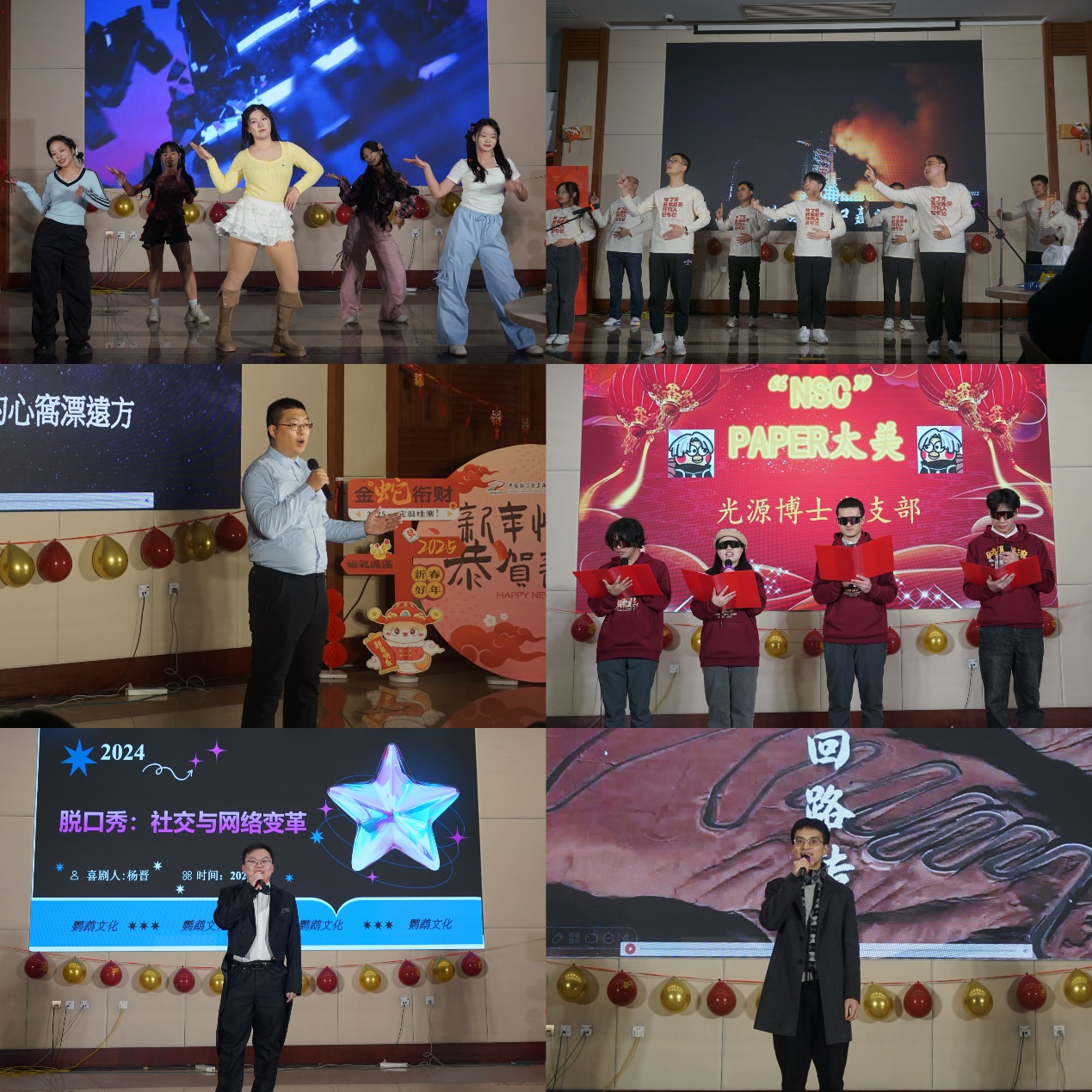 在第一篇章“薪火相传”中,2023级博士党支部的手语舞《国家》为我们展现了他们的家国情怀。硕士党支部范子煊带来的《海阔天空》,让我们感受到了梦想、坚持和永不言弃的精神,以及那份勇于追逐梦想的力量。光源博士党支部带来的《paper太美》,以幽默的语言让大家感受科研人员发文章的苦与乐。杨晋带来的脱口秀《社交与网络变革》,用轻松诙谐的方式来表达对社会现象的思考。上海硅酸盐所的陈宇昂带来歌曲《峰回路转》,引领我们穿越生活的曲折,感受每一个转角后的新希望和新风景。在第一篇章结束后,进行了中场小游戏“光盘拔河”,现场观众积极参与,气氛欢快热烈。