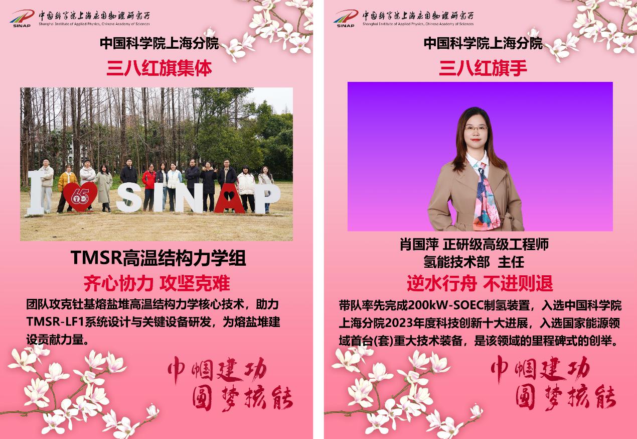 3月6日上午,所妇委组织全所女职工集体观看了中国科学院妇女工作委员会、工会女职工委员会举办的“抢占科技制高点 巾帼建功助攻坚”先进事迹报告会,一起聆听我院杰出女科学家的先进事迹,激励广大女职工以巾帼不让须眉的昂扬志气、舍我其谁的使命担当,为抢占科技制高点核心任务贡献巾帼智慧与力量。3月14日,在中国科学院上海分院举办的第二届三八红旗手、三八红旗集体表彰大会上,钍基熔盐堆高温结构力学组(负责人:王晓艳)荣获“上海分院三八红旗集体“称号,肖国萍获评“上海分院三八红旗手“称号。党委副书记、纪委书记王茂华勉励大家:上海应物所的广大女职工要始终聚焦研究所主责主业,自觉将个人发展融入国家战略科技使命的大局中,与时代发展同频共振;要自觉对标先进典型,永葆科研报国热忱,在攻坚克难中彰显使命担当;要以更加昂扬的姿态投身科技强国建设,为实现高水平科技自立自强作出新的更大贡献。