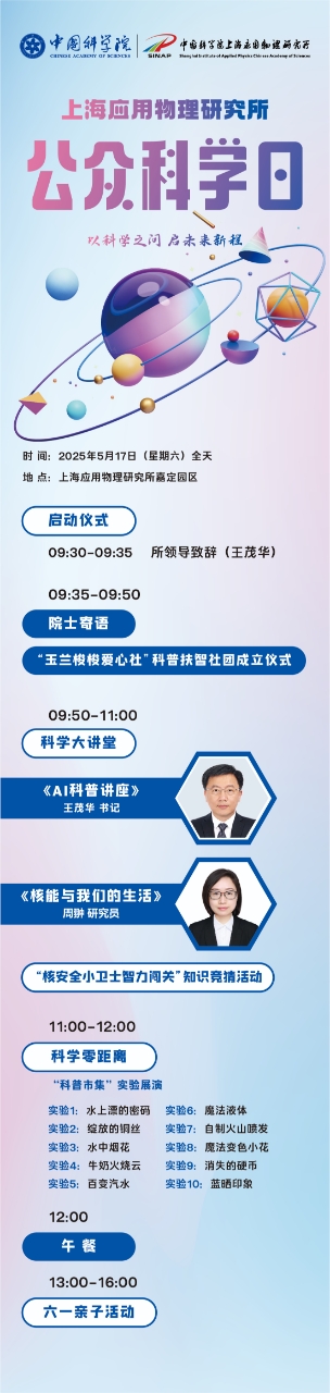 为进一步贯彻习近平总书记关于科普和科学教育工作的重要论述,落实新修订的《中华人民共和国科学技术普及法》要求,结合“学部成立70周年”主题,全面展示我所科学贡献与文化传承,促进科普工作高质量发展,上海应物所将于2025年5月17日开放嘉定园区,举办以“以科学之问 启未来新程”为主题的公众科学日活动。