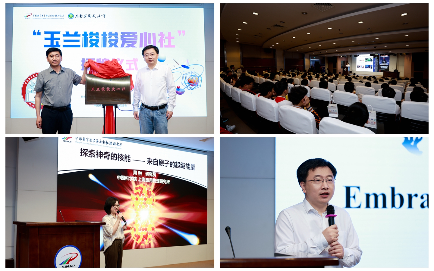 为了将科学的种子播撒到西部孩子的心田,建立长期科普扶智机制,本次活动还特别邀请了甘肃省民勤县南关小学的校领导和教师代表。南关小学专门为贫困儿童开设了“梭梭苗”读书社,辅导员李从莲现场介绍了“梭梭苗”读书社的基本情况。随后,王茂华与南关小学校长李守栋共同为“玉兰梭梭爱心社”科普扶智社团揭牌。该社团旨在发挥国立核科学研究机构的优势,积极承担科普启智的社会责任,通过前沿科学讲座、爱心物资捐赠等方式定向支持南关小学,帮助孩子们拓宽视野、感受科学魅力。