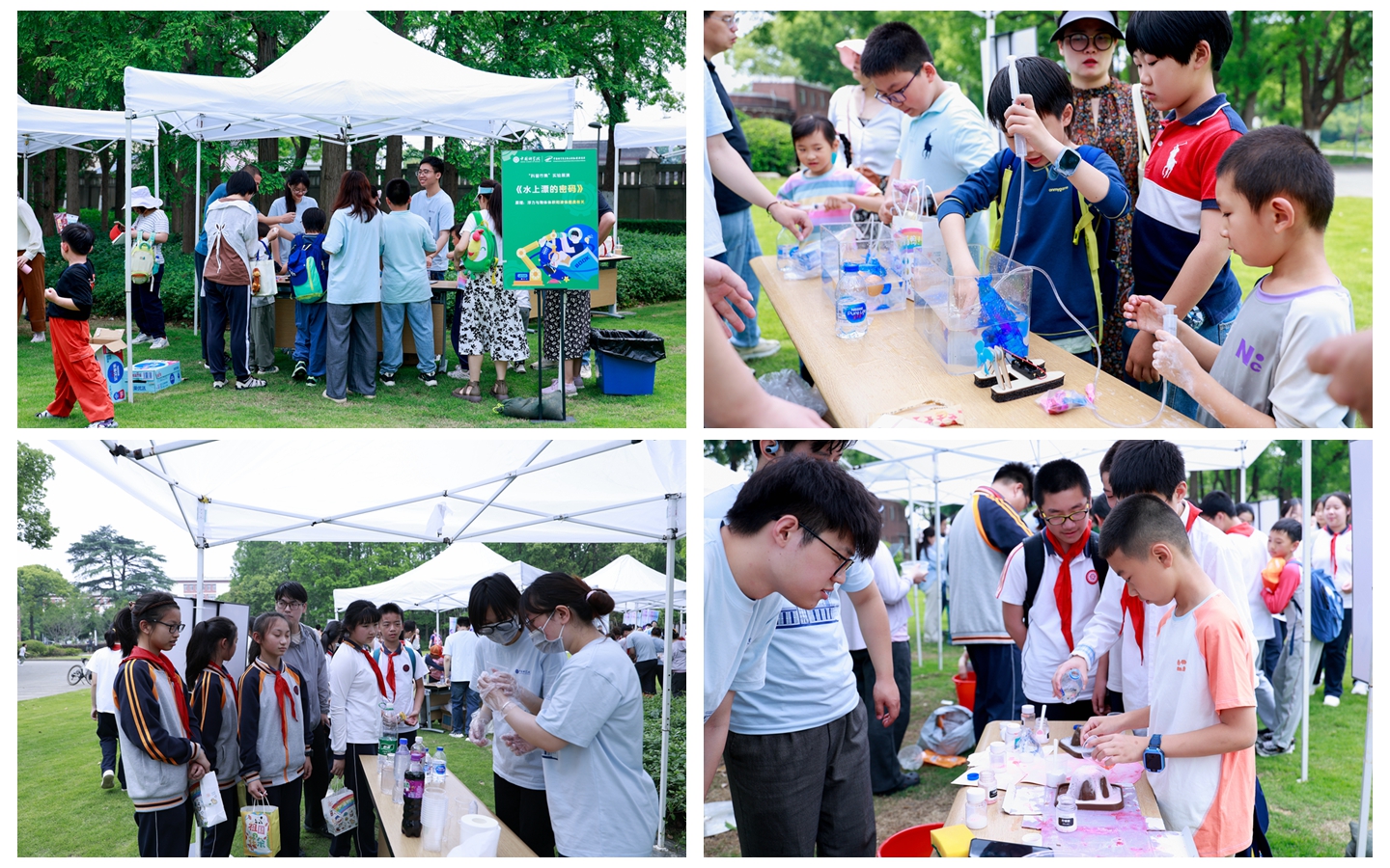 户外草坪上,科普市集以“科学零距离”为主题,打造沉浸式科学体验场景。来自上海应物所核力前行科普社团的研究生们带来了精彩的乐队表演以及“水上漂的密码”、“自制小风扇”、“水中烟花”、“牛奶火烧云”、“百变汽水”、“魔法液体”、“自制火山喷发”、“魔法变色小花”、“消失的硬币”、“蓝晒印象”等趣味科学小实验。在研究生志愿者的引导下,参与者亲手操作科学实验,观察奇妙现象,激发创造性思维。