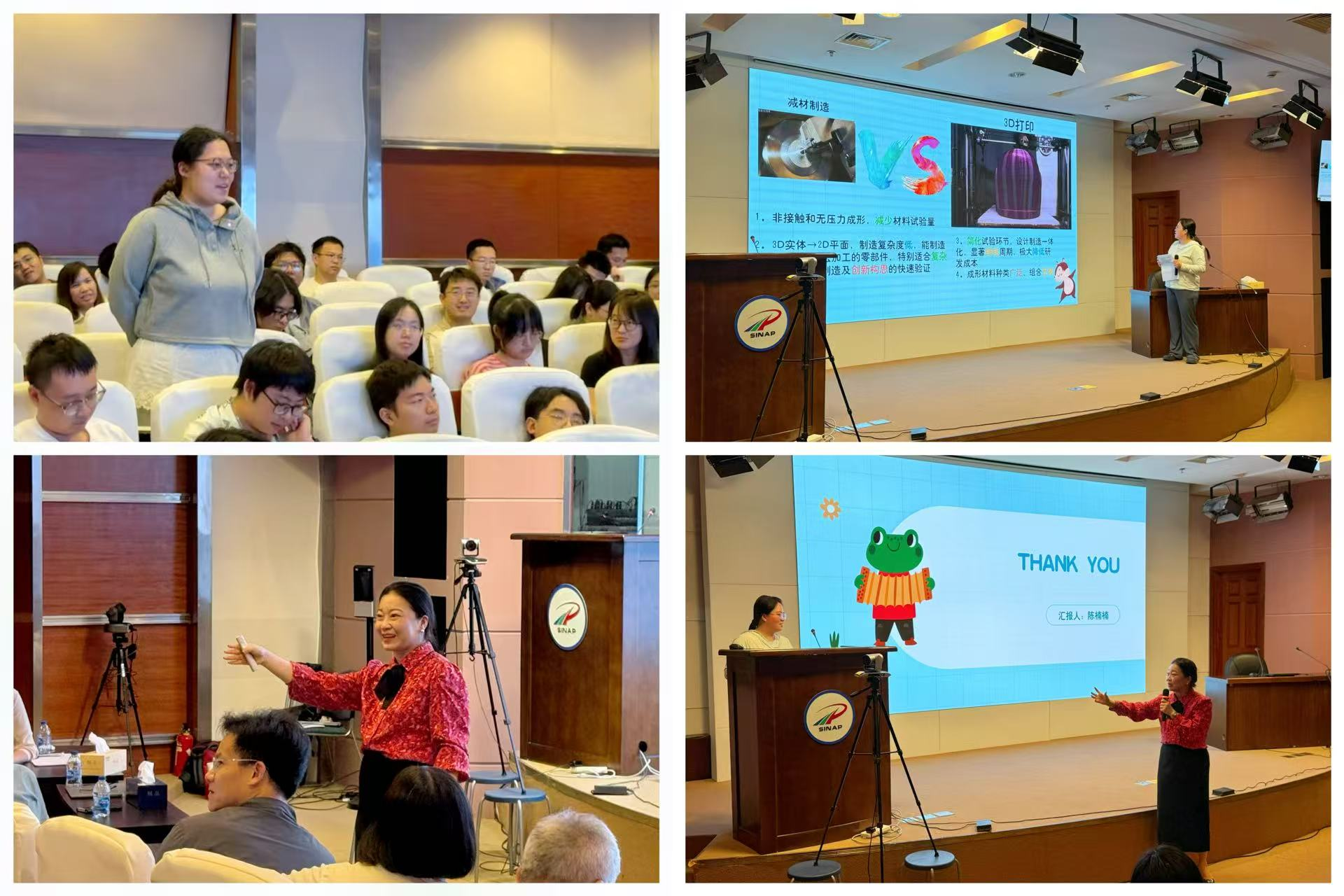 在互动环节中,张早老师带领同学们进行了呼吸与发声的专项训练,现场气氛热烈。她指导大家如何运用气息与共鸣,在科普场合中锻造出兼具“权威性”与“亲和力”的“可信”声音。掌握了这一基础,科普工作者可以将复杂的科研内容转化为生动易懂的科普语言,并在表达中融入个人风格与情感温度。张早老师还特别演示了“态势语言”如何与“呼吸发声”等非语言因素协同,为科学传播增效,并进行了细致的现场指导。“核力前行”科普社团陈楠楠为现场观众带来了题为《有趣的3D打印》科普报告,张早老师对科普报告进行了现场点评和指导。