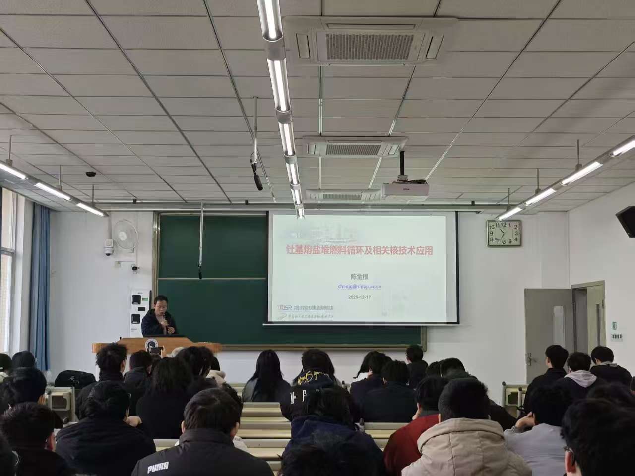 开班仪式结束后,陈金根作题为《钍基熔盐堆燃料循环及相关核技术应用》的学术报告。他系统介绍了研究所在此领域的战略布局与研发进展,重点阐述了钍铀燃料循环、熔盐堆同位素生产、核数据测量与数据库建设等前沿方向。报告内容深入浅出,现场师生互动积极,气氛热烈。