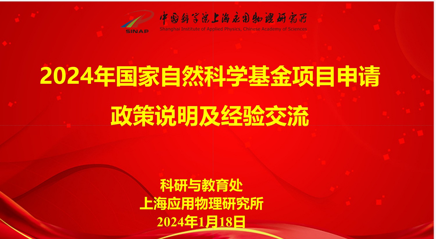 为贯彻党的二十大关于科技创新的新部署新要求,进一步落实基础研究工作和切实推进2024年度国家自然科学基金项目申报,2024年1月18日,中国科学院上海应用物理研究所科研与教育处组织召开了国家自然科学基金项目申请政策说明及经验交流会。副所长蔡翔舟出席会议并致辞。来自研究部门的相关领导、科研骨干以及近年入所人员等100余人参加了本次会议。会议由科研与教育处处长林俊主持。