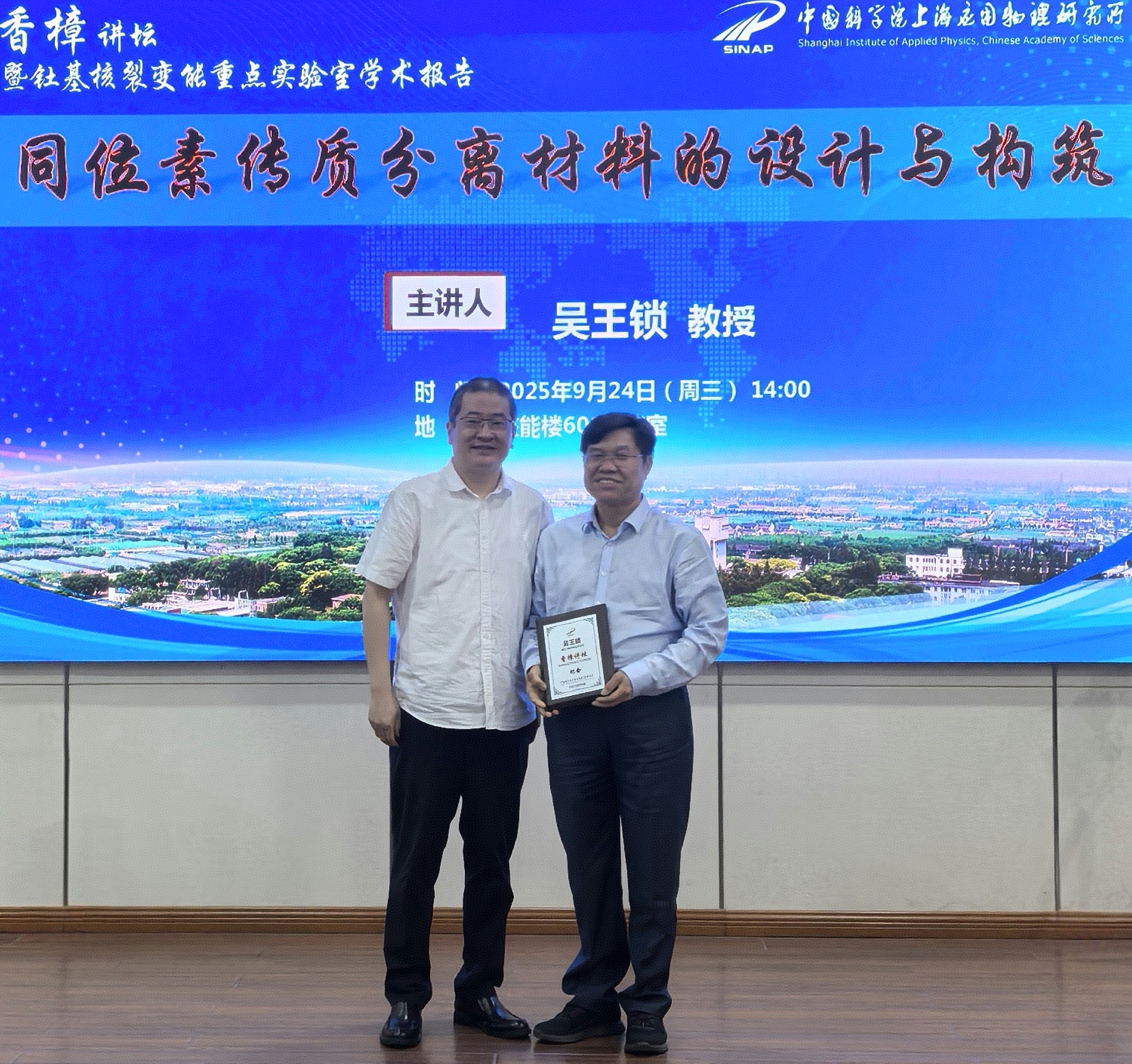 2025年9月24日,中国科学院上海应用物理研究所成功举办香樟讲坛暨钍基核裂变能重点实验室学术报告。本期讲坛邀请了兰州大学吴王锁教授担任主讲人,报告主题为“同位素传质分离材料的设计与构筑”。上海应物所副所长蔡翔舟、应用化学部副主任刘玉侠、科研与教育处副处长钟静、科技骨干、研究生等参加了本期讲坛。活动由科研与教育处副处长任翠兰主持。