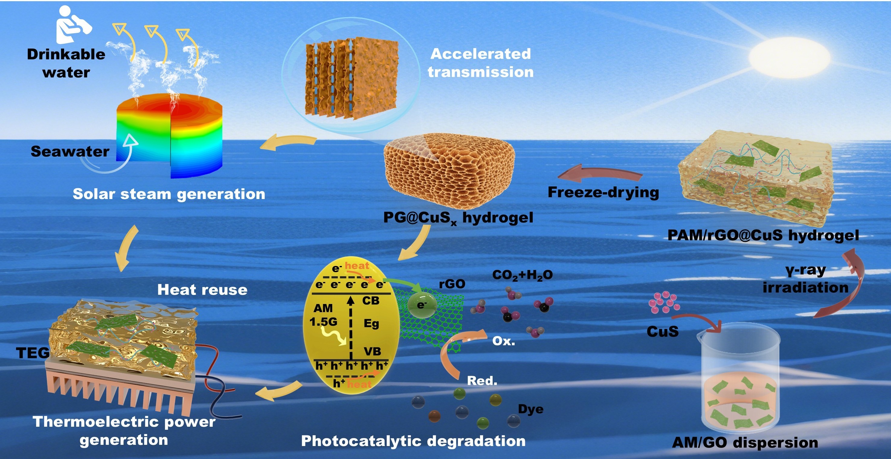 全球淡水资源紧张,太阳能蒸汽发电(SSG)技术因其绿色、低能耗的特点,成为解决水资源短缺的重要方向。然而,传统的光热蒸发材料在高温、高盐或污染水体中易发生结构破坏、性能下降,且难以同时实现高效蒸发、污染物降解和余热利用,限制其实际应用。基于团队前期在石墨烯/银复合水凝胶(Chemical Engineering Journal , 2023 ,147249)及石墨烯/MXene复合水凝胶(Desalination ,2025 , 118657)方面的研究积累,本研究进一步开发出一种名为PG@CuSₓ的“一体化”多功能光热复合水凝胶。该材料以亲水性的聚丙烯酰胺(PAM)为三维网络骨架,整合了具有广谱光吸收能力的还原氧化石墨烯(rGO)和窄带隙半导体硫化铜(CuS)。以上海应物所的伽马射线辐照平台为基础,通过伽马射线辐照聚合与冷冻干燥技术,在常温常压下制备出具有垂直多孔微通道的多功能光热水凝胶。研究发现,该水凝胶具有以下特点:①高效光热蒸发:在标准太阳光强下蒸发速率达8.1 kg·m−2·h−1,通过调控可提升至28.7 kg·m−2·h−1,实现蒸发温度低于环境温度的“全冷蒸发”。②优异耐盐与净化能力:在高浓度盐水中连续光照16h无盐结晶,对海水盐分去除率超过99.9%,产水符合WHO饮用水标准。③污染物降解能力:可高效降解亚甲基蓝等有机污染物,实现“蒸发-净化”一体化。④热电联产功能:结合热电发电机可实现883 mV的电压输出,拓展了太阳能的多级利用途径。