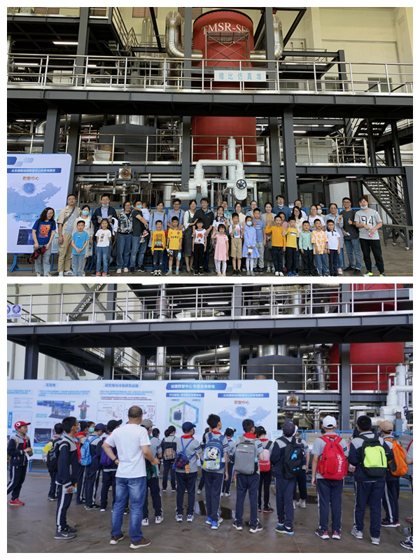 在备受期待的现场参观部分,小观众们有序地跟随志愿者分组参观了钍基熔盐堆核能系统成果展厅、世界首座钍基熔盐仿真实验堆、熔盐制备试验装置、高温制氢储能装置、自然循环回路等核科学研究设施。叶祥熙、林逍、蔡创雄三位科研人员分头驻点讲解,针对不同的年龄段开展“精准科普”,通俗生动地介绍了钍基熔盐堆核能系统的研发成果、熔盐堆余热排放研究平台熔盐自然循环回路的工作原理、高温电解制氢的工作原理及氢燃料电池等前沿科学知识。现场参观实验装置使同学们真正走进了科研一线,当平时神秘且遥不可及的核科学研究装置近在眼前,大家纷纷惊叹科学的炫酷与神奇。参观过程中同学们积极提问,与科研人员进行了充分的互动,活动取得了良好的科学教育和宣传效果。启思明智,倡导科学,这也是中国科学院及上海应物所一直以来积极承担科学普及的社会责任,致力于高端科研资源科普化的意义所在。