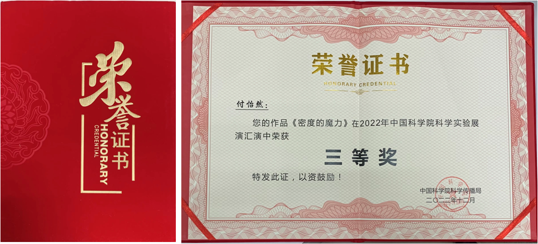 为深入贯彻落实《关于新时代进一步加强科学技术普及工作的意见》,大力普及科学知识、弘扬科学精神、传播科学思想、倡导科学方法,2022年11月,中国科学院科学传播局以线上形式开展了2022年中国科学院科学实验展演汇演暨全国科学实验展演汇演大赛。近日大赛结果揭晓,上海应用物理研究所荣获最佳组织单位,在读研究生付怡然《密度的魔力》和王静《有趣的静电》两个作品荣获三等奖。