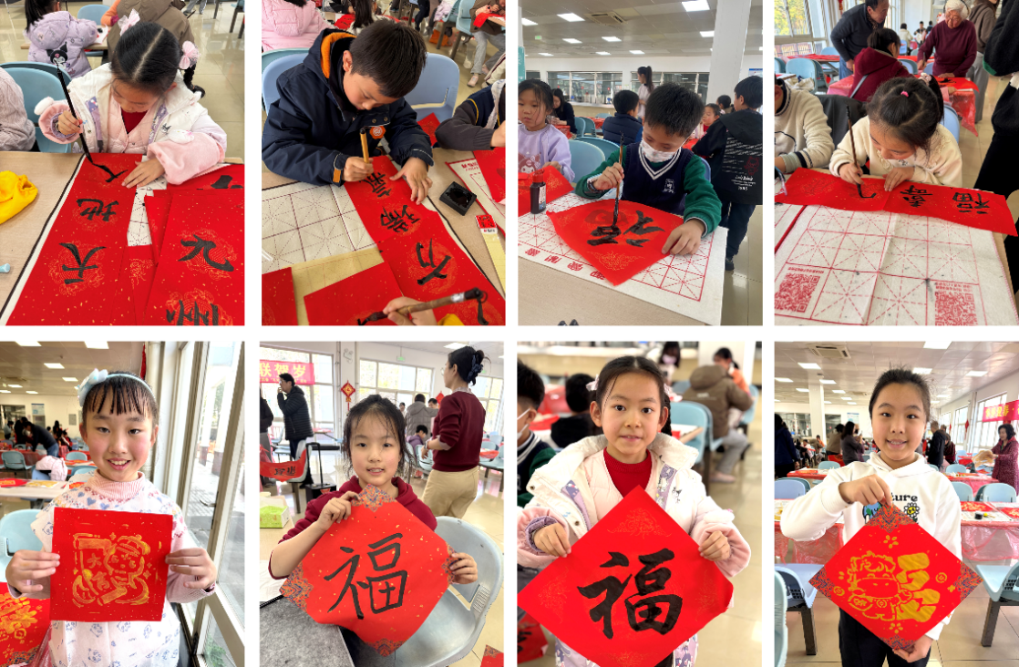 在“‘核’你一起 萌笔生福”环节,孩子们通过“写春联、画福字”体验传统文化。书写春联时,小朋友们认真执笔、蘸墨,在红纸工整地写下充满吉祥寓意的联句;画福字时,大家则尽情发挥创意:有的用彩笔勾勒轮廓、填涂缤纷色彩,有的通过拓印方式呈现金色福字,形式别致新颖。现场洋溢着浓厚的节日气氛,孩子们在欢声笑语中不仅学习了传统文化知识,也亲身感受到传统文化的魅力。