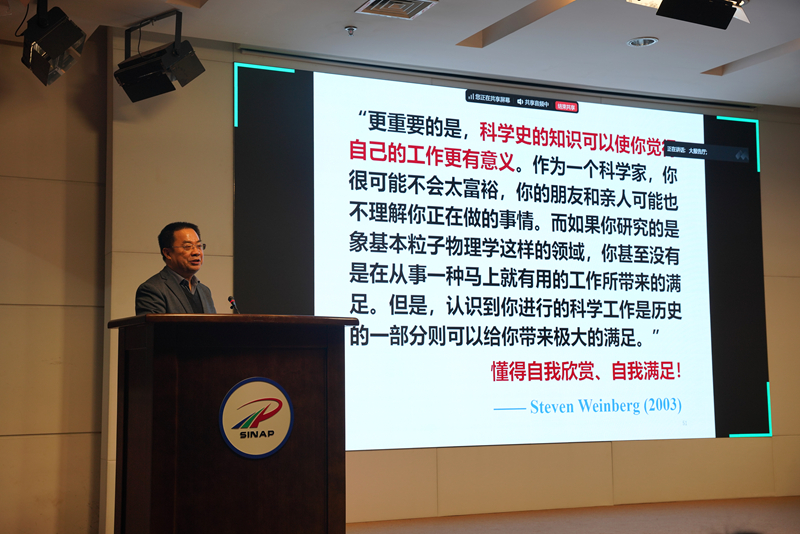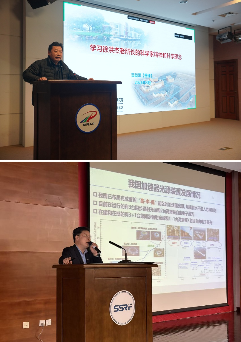 在所长面对面环节,贺战军以《学习徐洪杰老所长的科学家精神和科学理念》为题,深情讲述了徐洪杰研究员带领全所走出发展低谷、再创辉煌,以及应国家战略需求两度转变研究领域,带领科研团队建成上海光源,引领全球钍基熔盐堆技术研发的奋斗历程。贺战军通过图文并茂的讲解,生动展现了徐洪杰老所长作为战略科学家、创新引领者,追求卓越、甘于奉献、自信自立的崇高科学家精神。邰仁忠以《光子科学技术与未来展望》为题,系统梳理了上海光源、软X射线自由电子激光装置、质子治疗装置等重大科技基础设施的建设与发展历程,详细解读上海光源未来发展规划,鼓励全体研究生主动投身国家重大科研任务,树立报国之志,锤炼过硬本领,成长为堪当大任的科研栋梁之材。